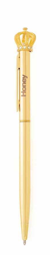 Gold plated ballpoint pen. Crown motif with clear synthetic crystal detail. Black ink. Universal refill.