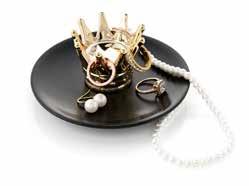 Shiny gold crown and black ceramic accessories tray.