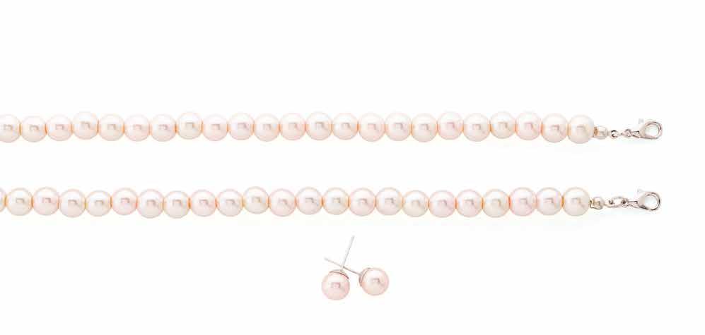Rhodium plated necklace, bracelet and earring set. Pink, soft pink and cream glass pearls. Lobster claw clasp. Necklace 44cm extends to 52cm. Bracelet 20cm extends to 25cm. Pink earrings 8mm.