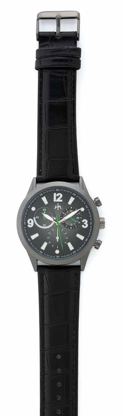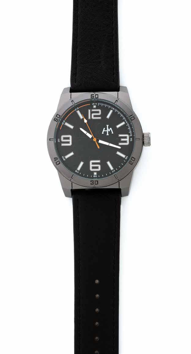 Gunmetal plated bracelet style analogue watch. Black PU strap. Black dial. White hands. Closes 17cm to 22cm. 48mm case.