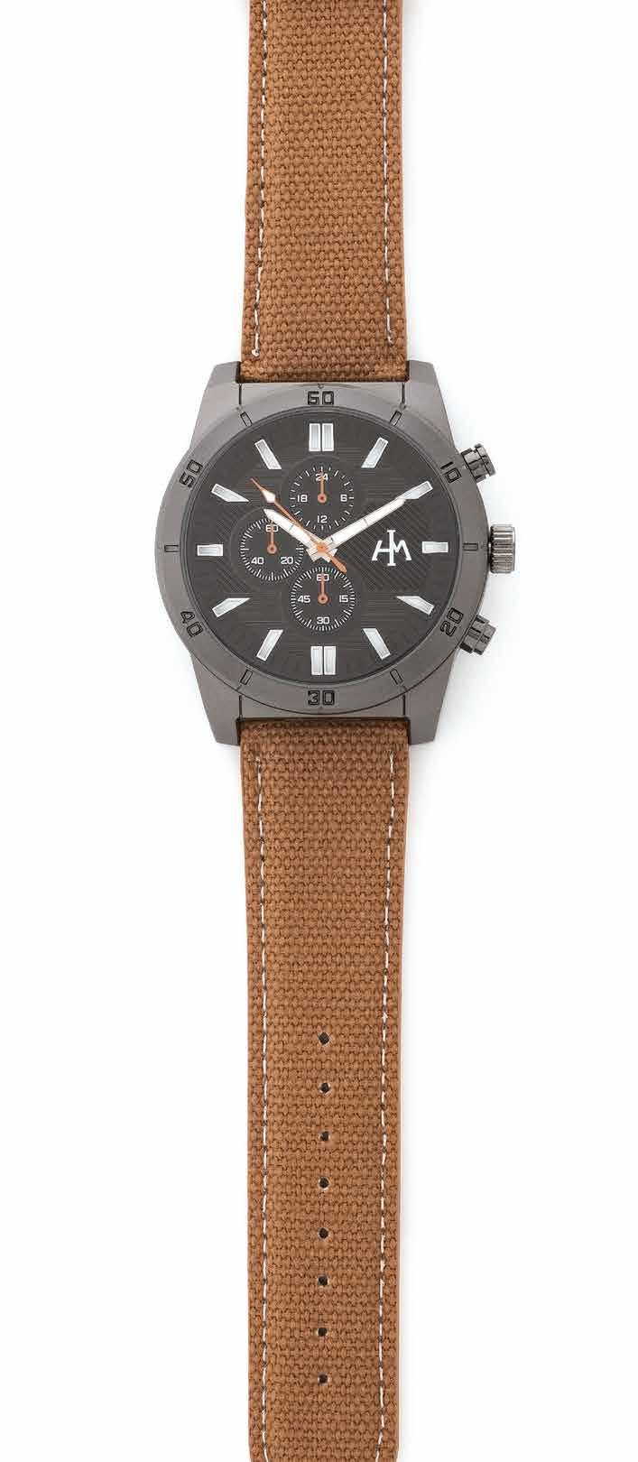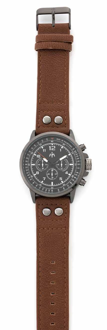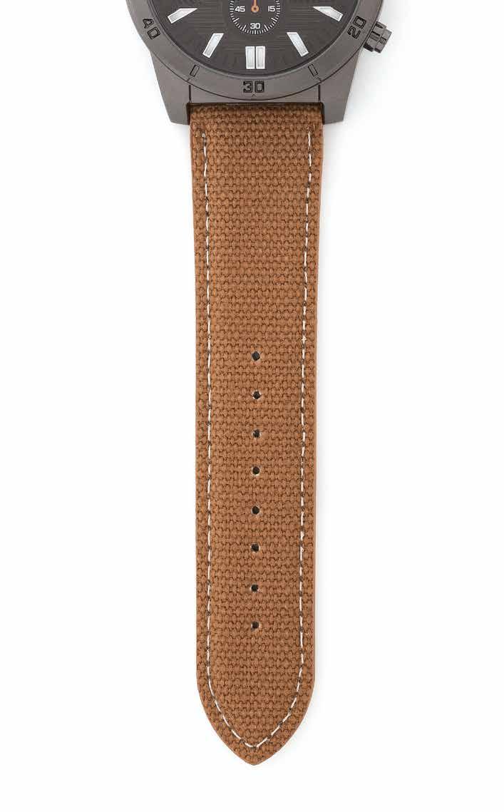 Gunmetal plated bracelet style analogue watch. Tan PU strap. Black dial. White hands. Nonfunctional decorative detail. Closes 17cm to 22cm. 48mm case.