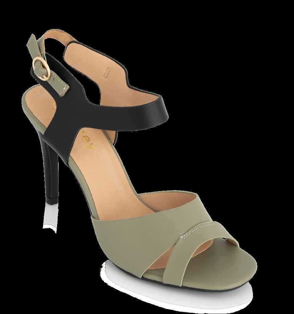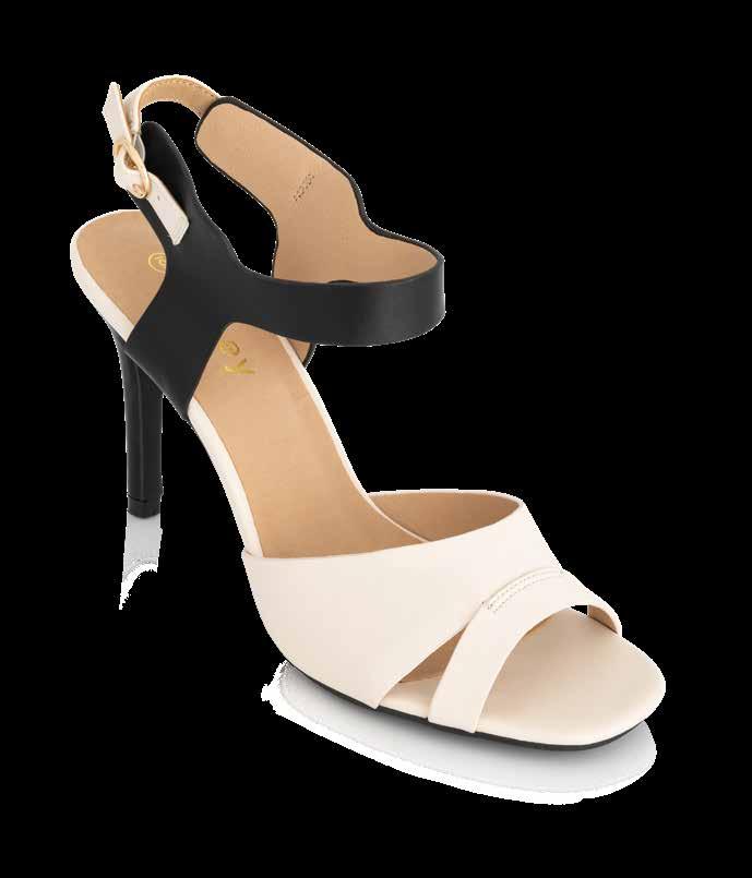 Cream PU high heel sandal. Black PU trim. Gold plated buckle closure. Heel height: 95mm.