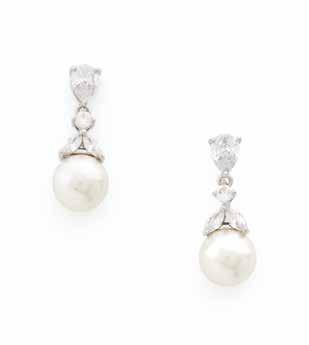 Rhodium plated earrings. Clear zircon. White synthetic pearls. 25mm drop.