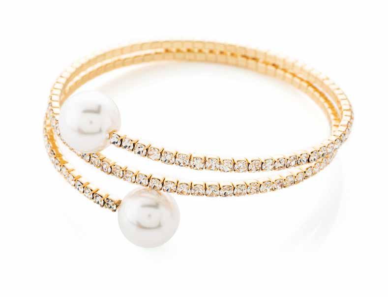 24ct gold plated wrap around bracelet. Clear rhinestones. White synthetic pearls. 60mm inner diameter. Semi-adjustable. 15mm width.