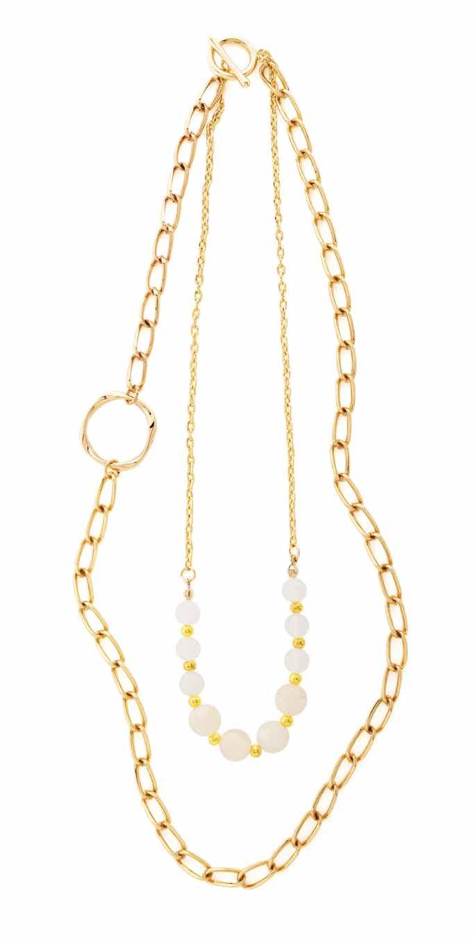 24ct gold plated two row necklace. White opaque synthetic beads. 47cm. Toggle clasp. R349