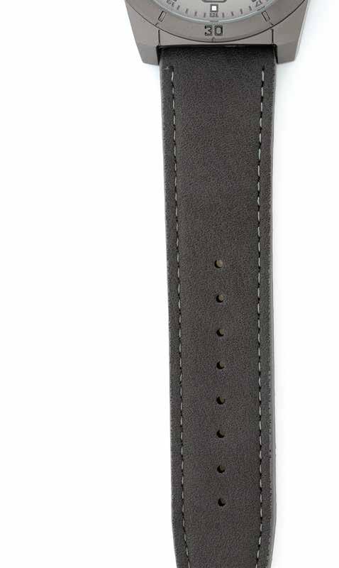 Gunmetal plated bracelet style analogue watch. Grey PU strap. Light grey dial. White hands. Closes 17cm to 22cm. 48mm case.