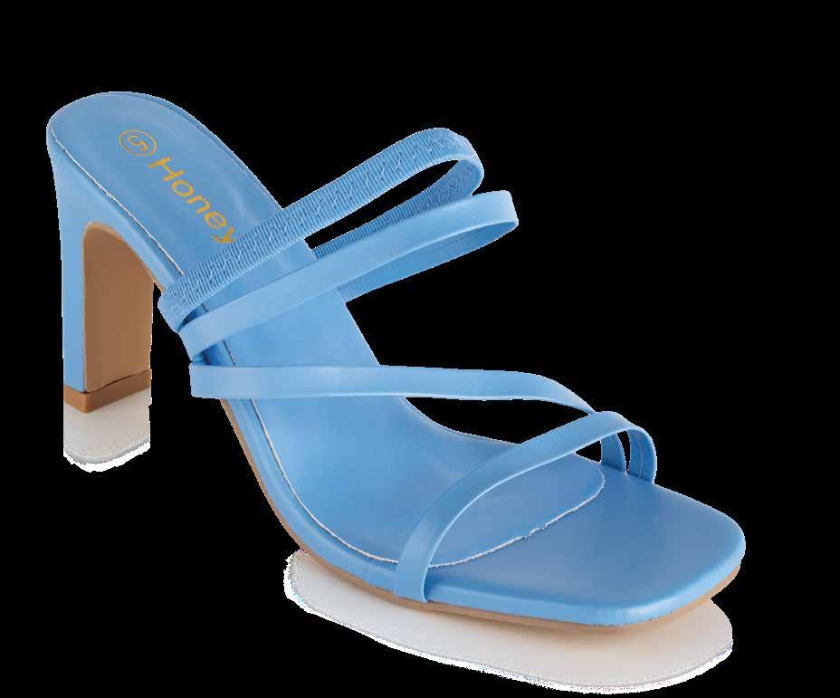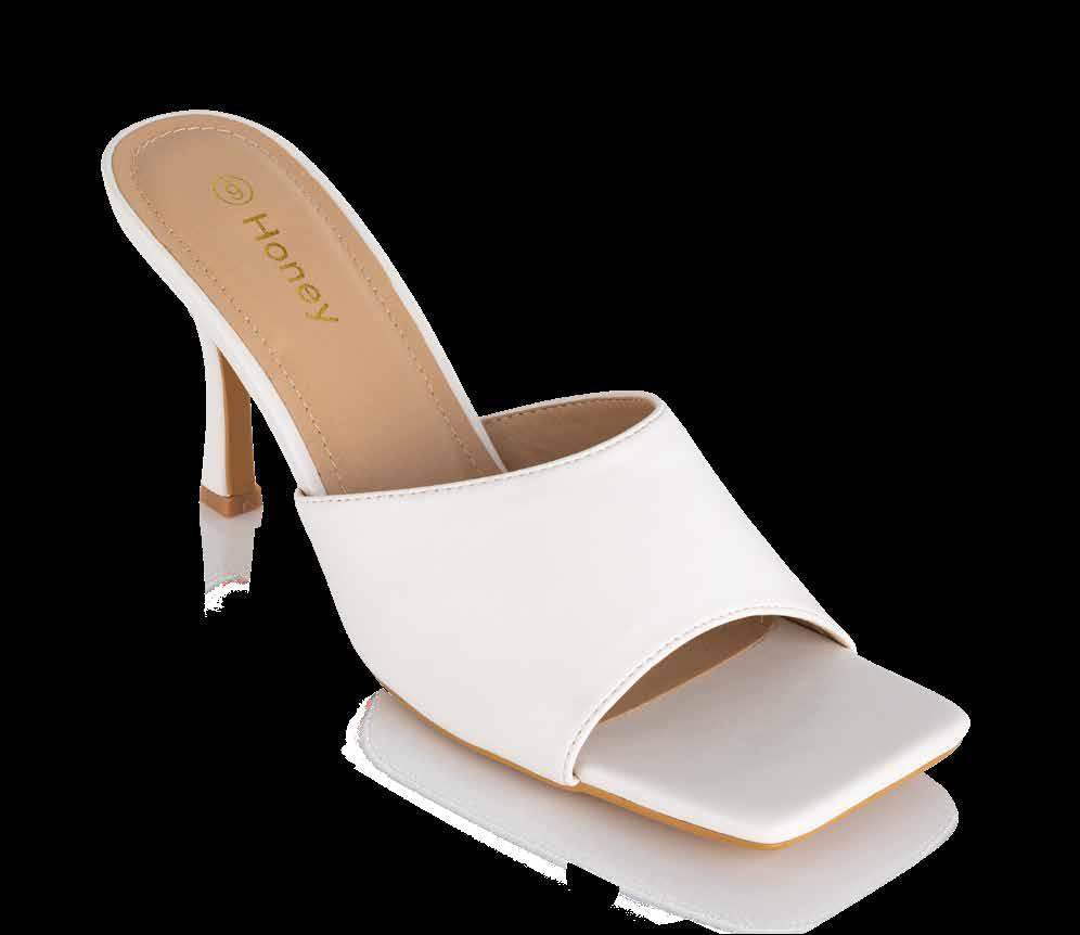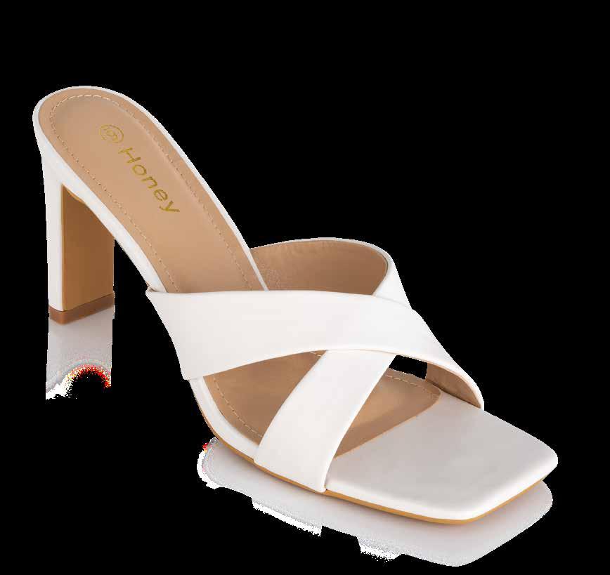 White PU slip-on square toe sandal. Rubber sole. Heel height: 90mm.