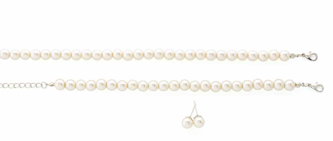 Rhodium plated necklace, bracelet and earring set. Cream glass pearls. Lobster claw clasp.