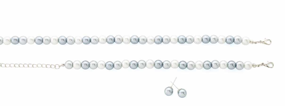Rhodium plated necklace, bracelet and earring set. Soft grey, dark grey and cream glass pearls. Lobster claw clasp. Necklace 44cm extends to 52cm. Bracelet 20cm extends to 25cm. Grey earrings 8mm.