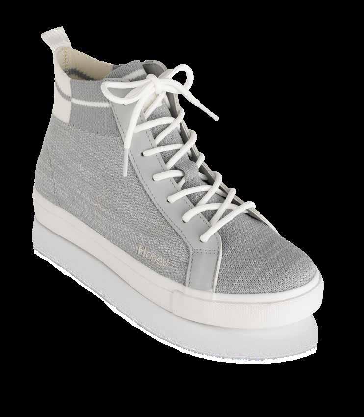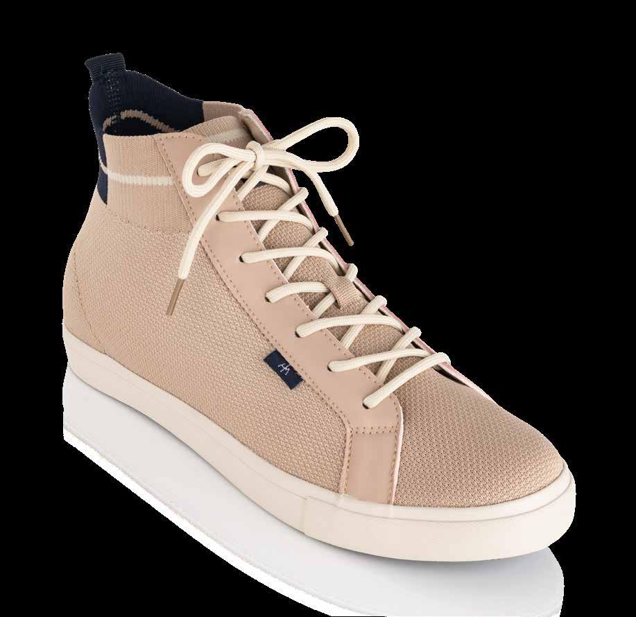 Honey man comfy high top lace up flyknit sneakers. Taupe with navy and light beige trim. Flat rubber sole. 23mm.