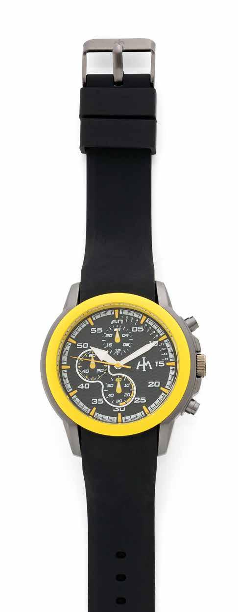 Gunmetal plated bracelet style analogue watch. Yellow detail. Black silicon strap. Black dial. White hands. Non-functional decorative detail. Closes 15.5cm to 21.5cm. 46mm case. R349
