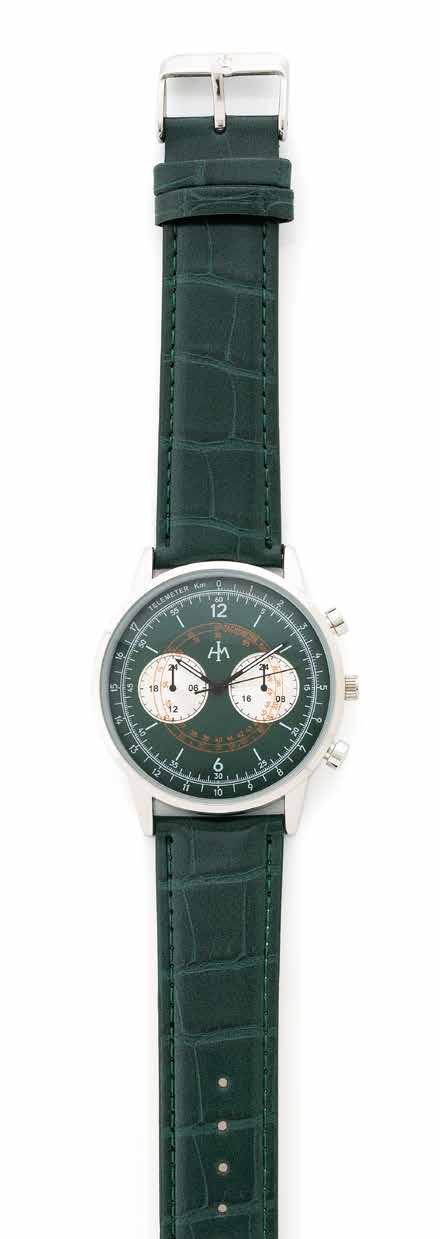 Rhodium plated bracelet style analogue watch. Green mock-croc PU leather strap. Green dial. White hands. Nonfunctional decorative detail. Closes 16.5cm to 21.5cm. 43mm case.