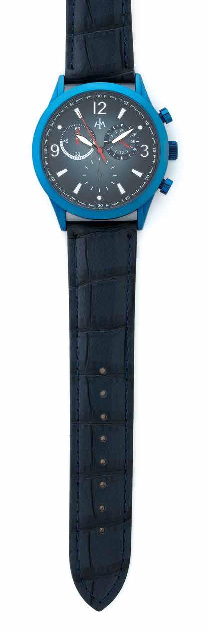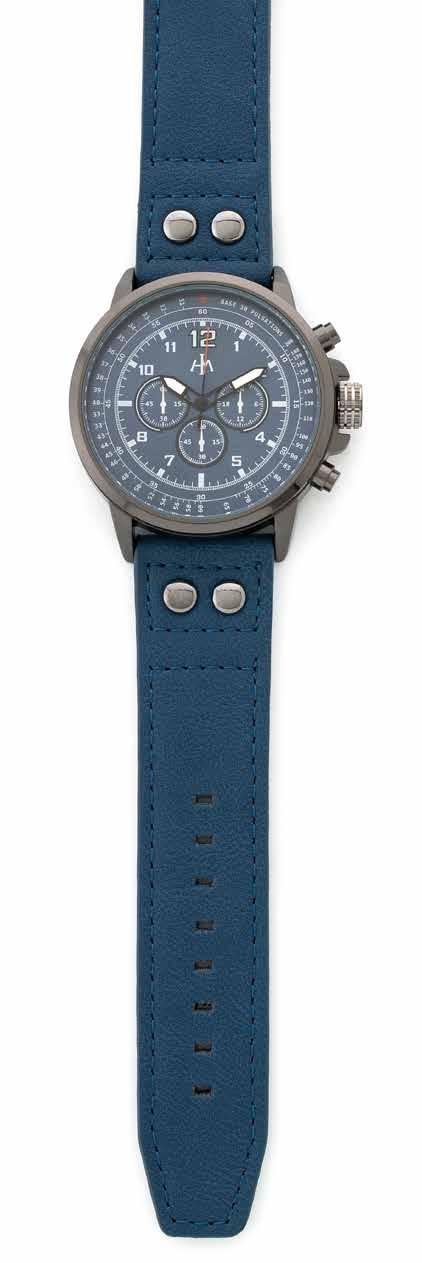 Gunmetal plated bracelet style analogue watch. Blue PU leather strap. Blue dial. White hands. Non-functional decorative detail.