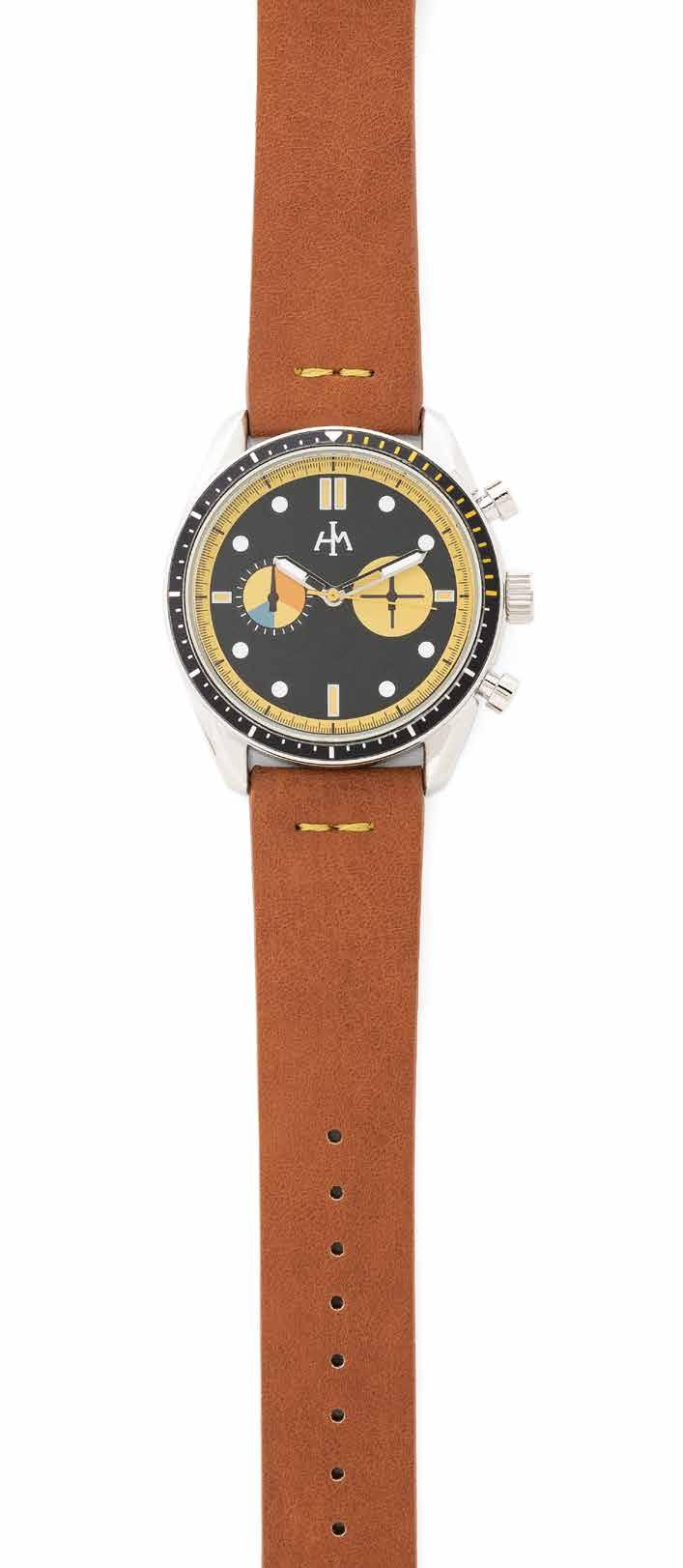 Rhodium plated bracelet style analogue watch. Tan PU strap. Black and yellow dial. White hands. Nonfunctional decorative detail. Closes 16.5cm to 21.5cm. 44mm dial.