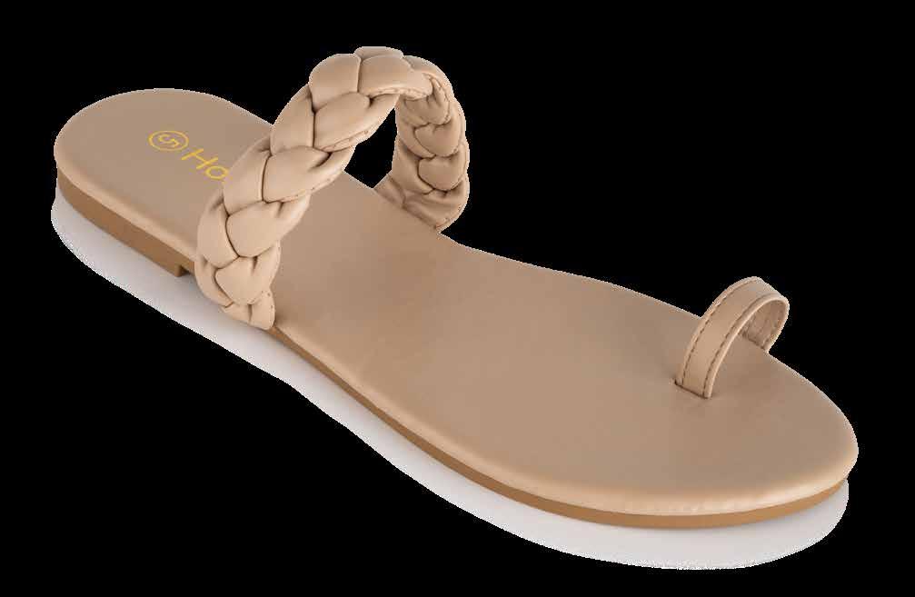 Rose gold PU flat slip-on sandals. Gold plated hardware. Heel height: 10mm.