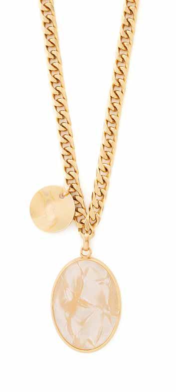 24ct gold plated necklace. Light peach mottled resin disc. 46cm extends to 56cm. 45mm drop.