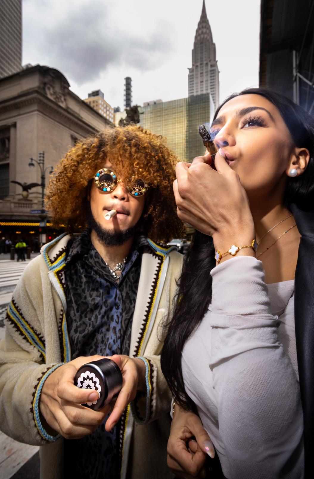 Artist @badservices models the latest Flower Mill grinders outside Polanco Brothers dispensary on 42nd Street near Bryant Park