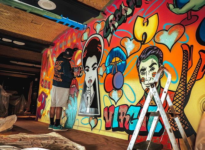 “[It came from] an idea that I wanted to do where you walked into this floral NFT world,” she describes. “Then Etain does a lot of living wall stuff with beautiful real plants inside their spaces. I wanted to take that energy, [even though] we couldn’t have live plants, and carry it over so there’s continuity between the different spaces, but it’s still graffiti and fun. It brings the natural element of flower.”
