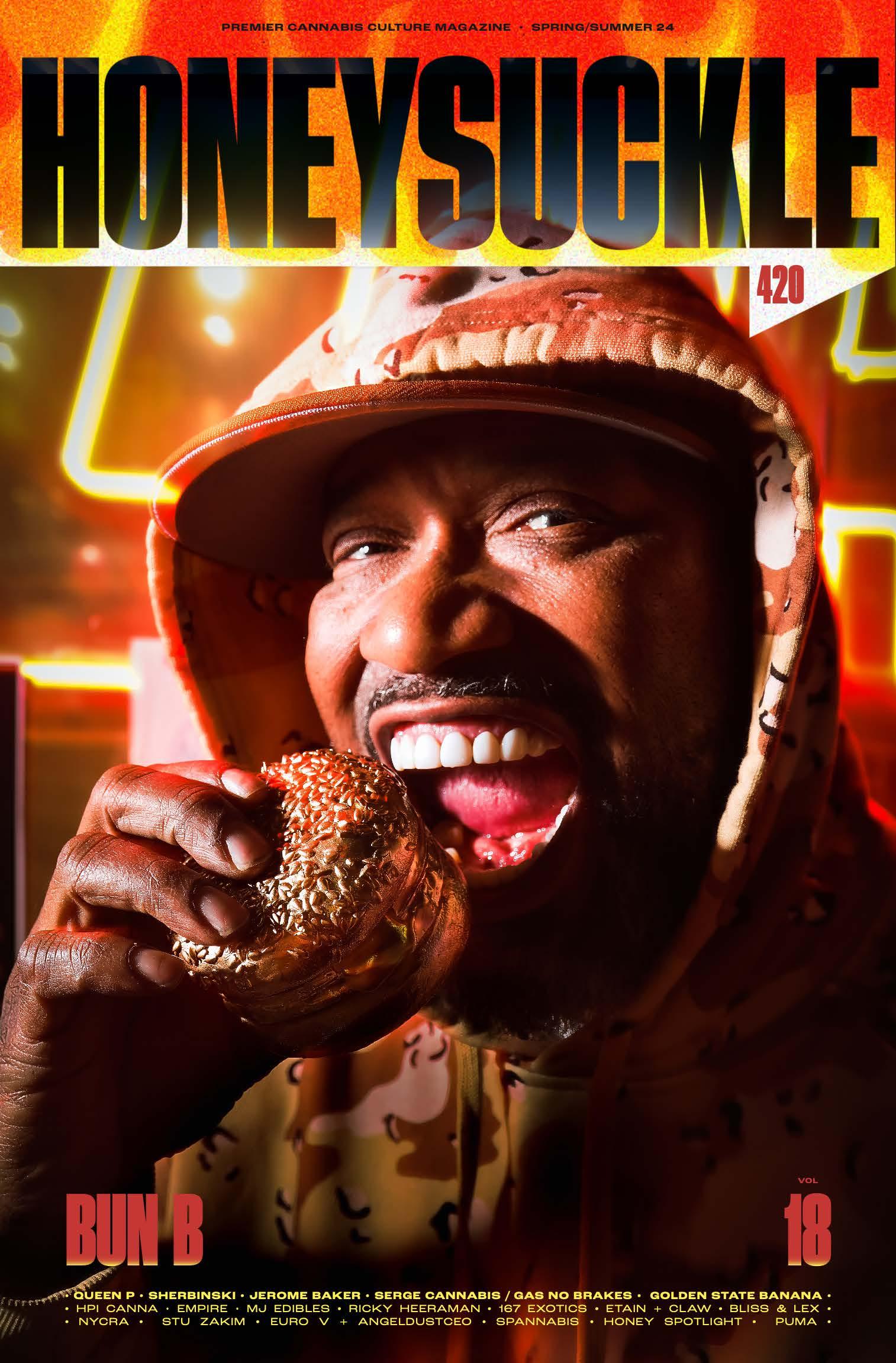 1 T.O.C. Get into something good! 2 PUBLISHER’S LETTER From the honey hive 3 MASTHEAD These wonderful people make this mag happen 5 ETAIN Claw Money 7 STU ZAKIM Emperor of PR 8 HOUSE OF BRANDS HPI Canna 10 DANK by Definition 11 BLISS & LEX Housing Works 12 167 EXOTICS The rise of ... 14 NYCRA Street Equity 15 MJ EDIBLES Cat got your gummy? 16 EMPIRE NYC’s Cannabis Club 18 GOLDEN STATE BANANA Questions from Queenee 20 BUN B Thrill of the TRILL 26 QUEEN P Sun Goddess 29 GRAV x DGK x Pleasures 30 SHERBINSKI Gene-ius 32 SERGE CANNABIS / GAS NO BRAKES Brotherly love from seed to sale. 34 metaWRK A revolution in immersive tech 35 JEROME BAKER Master Glass 38 RICKY HEERAMAN Brushstrokes of legacy 46 HONEY SPOTLIGHT Leading Ladies of Cannabis 47 HALLE Humboldt Seed Company 48 BEAUTY & THE BUD Is greenwashing making CBD toxic? 49 NEW YORK FARMS Meet the state’s licensed cultivators 51 NYC CANNABIS PARADE Join the nation’s longest-running cannabis event 52 SPANNABIS New Yorkers in Spain 56 HONEYSUCKLE STUDIOS Smile, you’re on Honey Camera! 57 HONEYSUCKLE ON THE LOOSE Where in the world is Honeysuckle? 58 PUMA From Black Ink to green flower 59 WAKE AND BAKE The podcast for the culture 60 RE-LEGALIZE NEPAL From dealer to healer 62 GRASSLANDS High hopes for the next generation 63 THE BUZZ Love grows where Larkspur Botanicals goes 63 EURO V ANGELDUSTCEO Sesh Gods