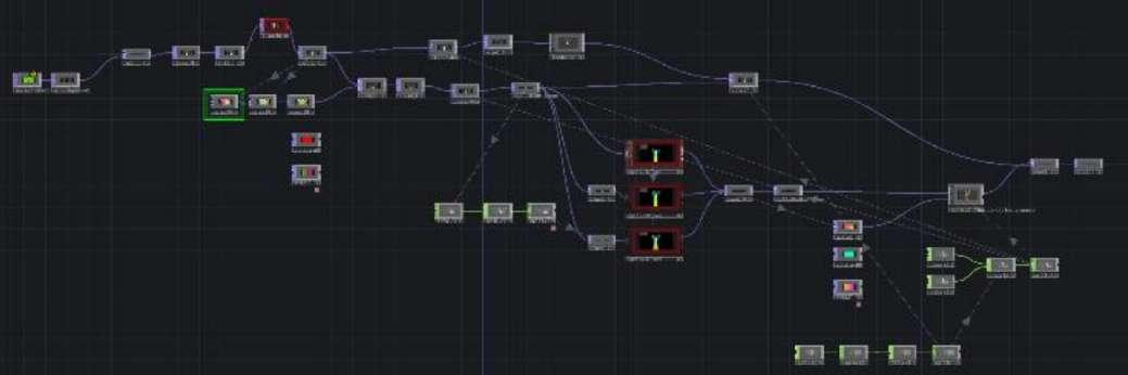 A keyboardin component is added to reset the count value to 0. Next, logic and express components are connected and multiplied using the math component to determine the subsequent count value. A chopexecute component is also connected, with code written to control the different changes in the two switch components and the cross component.