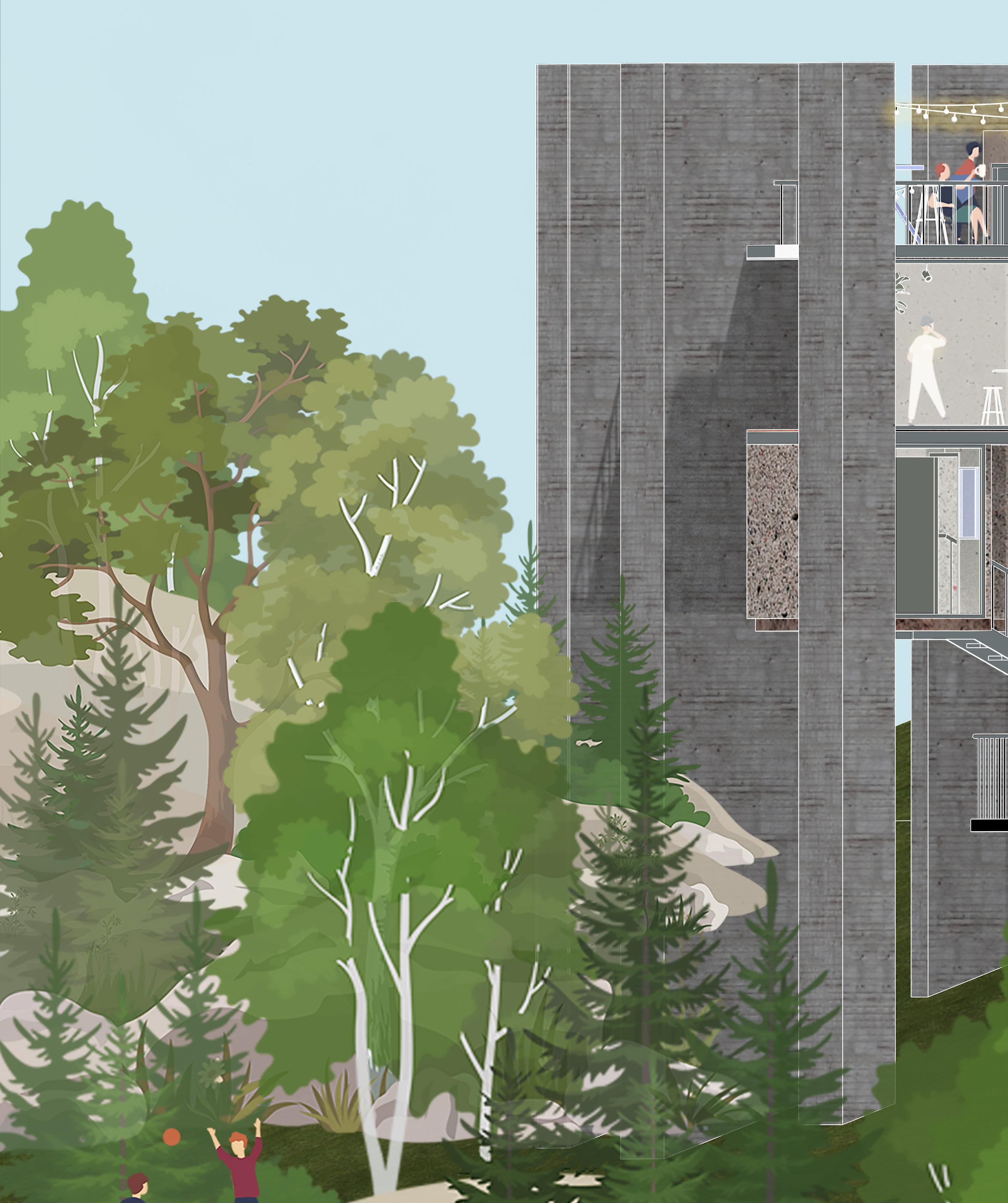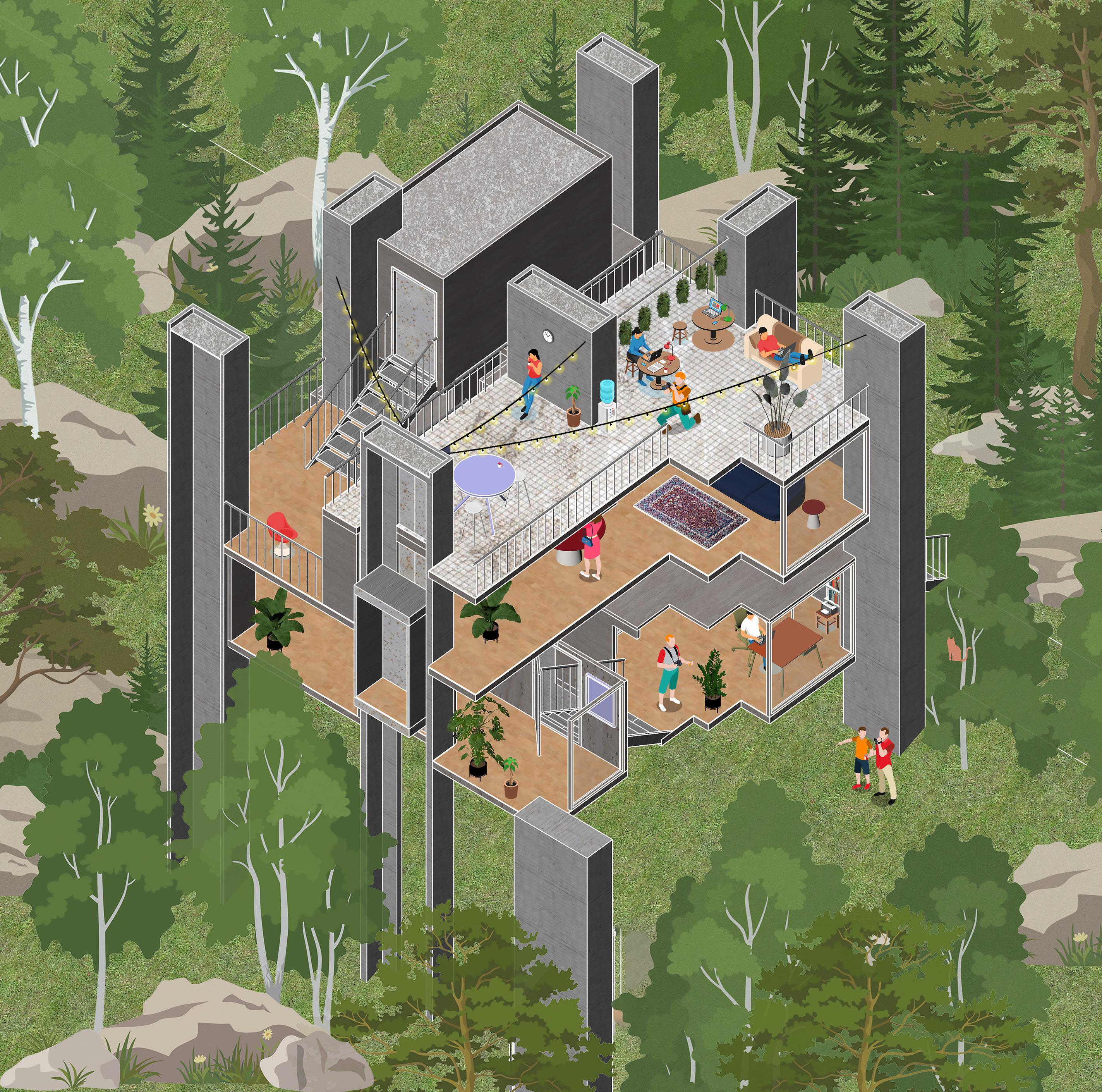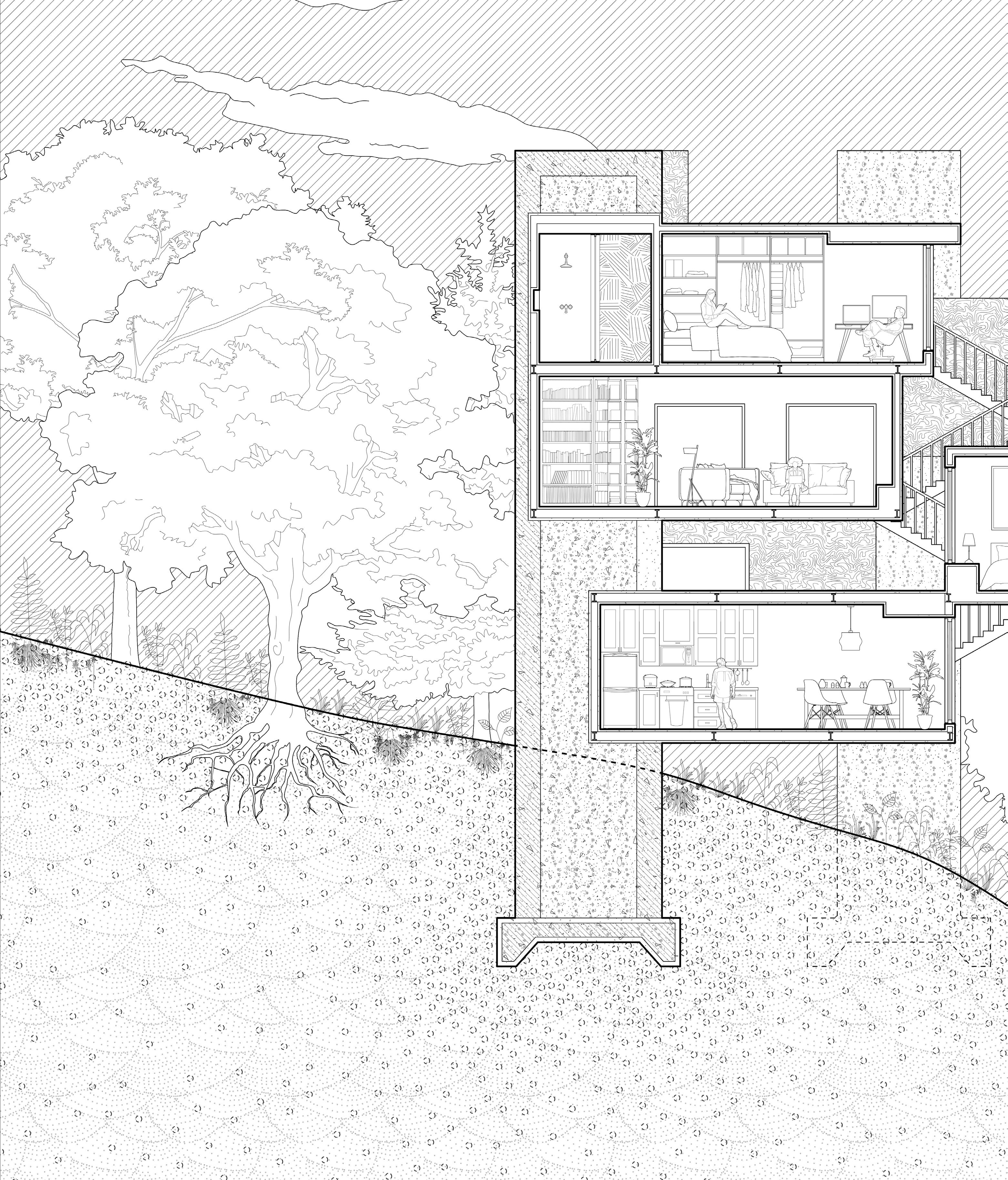 Through a design strategy of intersection, interconnected spaces are created, ultimately shaping a multifunctional co-housing residence. While enjoying their own private spaces, people also share access to a vibrant and dynamic public environment.