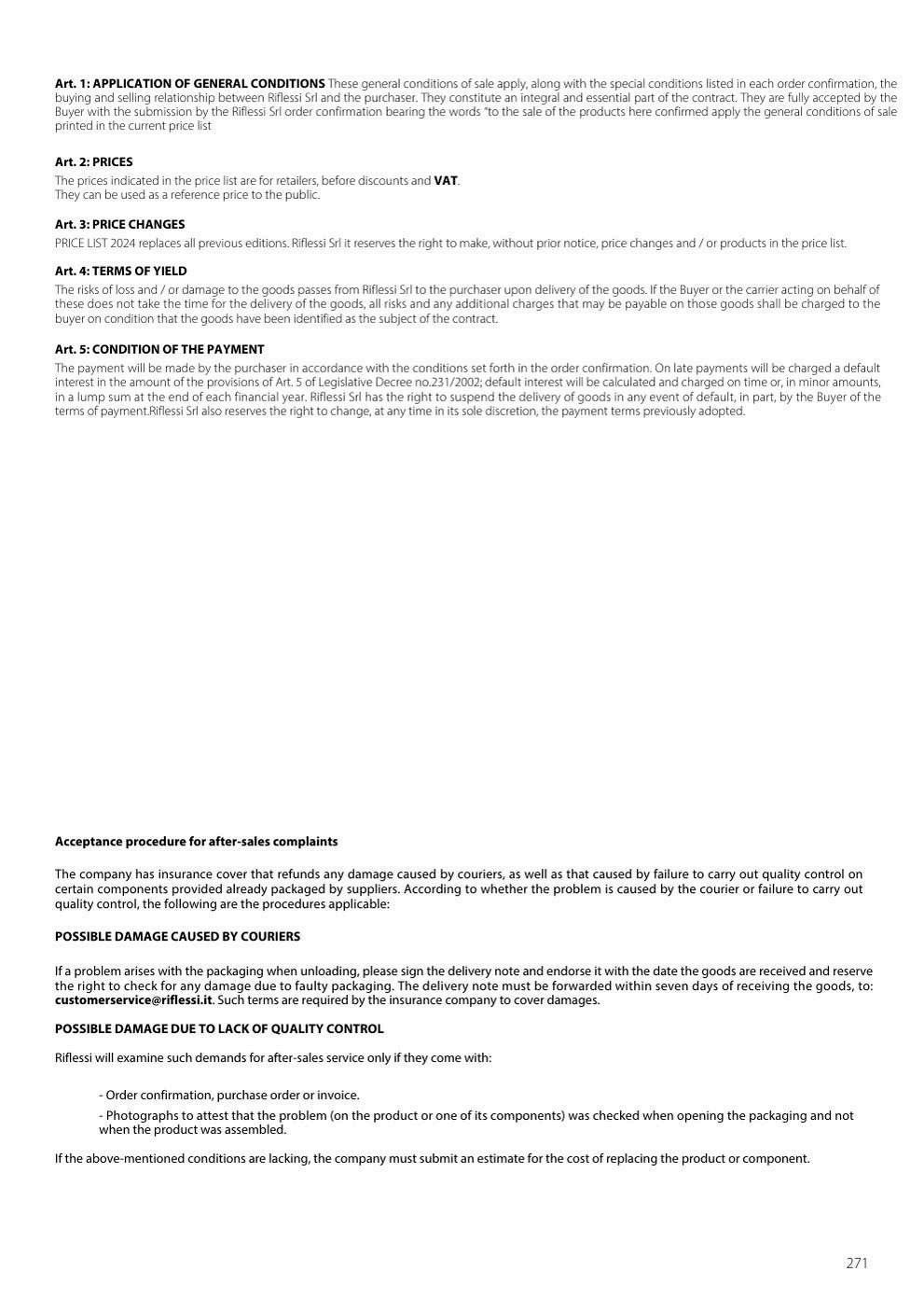 ART. 8: RETURNS We will not accept returns of goods unless previously requested by specific model and expressly authorized written by Riflessi Srl The goods to be made must be received by the deadline of 60 days from the date of the relevant authorization The goods must be delivered exclusively with vehicles engaged by Riflessi Srl and always accompanied by the appropriate document return authorization The use of the couriers can take place only with the express written consent of Riflessi Srl The conservation status of the goods will be at Riflessi Srl carefully checked the return of the same and in case of damage not attributable to Riflessi Srl it will not be recognize the value of the individual pieces If for lack original (or packaging designed to preserve the integrity of the goods during transport) the goods are demaged, Riflessi Srl has the right to charge the Buyer the necessary repair costs or not to accept the return The return of the goods delivered will be issued on the credit note, which in any case will be based on the prices of the bill specifies the details of which must necessarily be mentioned in the transport of the goods returned Any goods sent to replace will be regularly invoiced If the replacement goods will not be made within 60 days, Riflessi Srl will reject the return and issue bank receipt of the balance For warranty replacement involving returns, Riflessi Srl reserves the right to invoice the goods sent to replace if they are not found on goods made vices of production attributable to Riflessi Srl