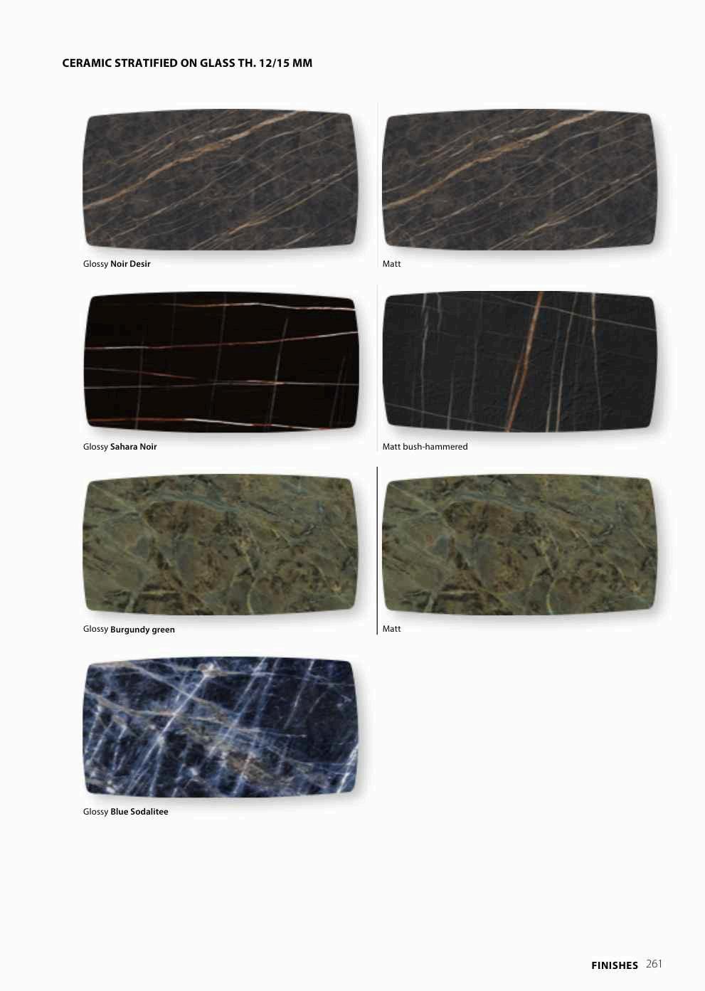 Matt/glossy Gold Calacatta Bush-hammered matt / glossy white statuary Bush-hammered matt Anthracite Savoy Stone Matt/glossy Noir Desir Glossy Patagonia Bush-hammered matt/glossy Sahara Noir bronzed mirror e ect