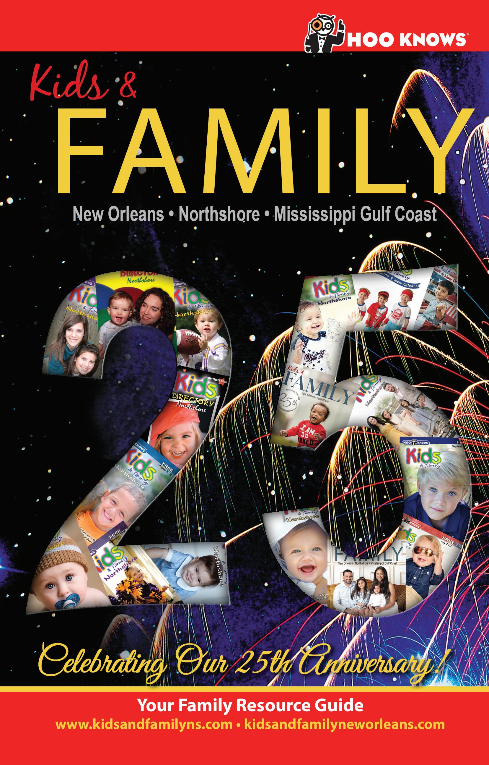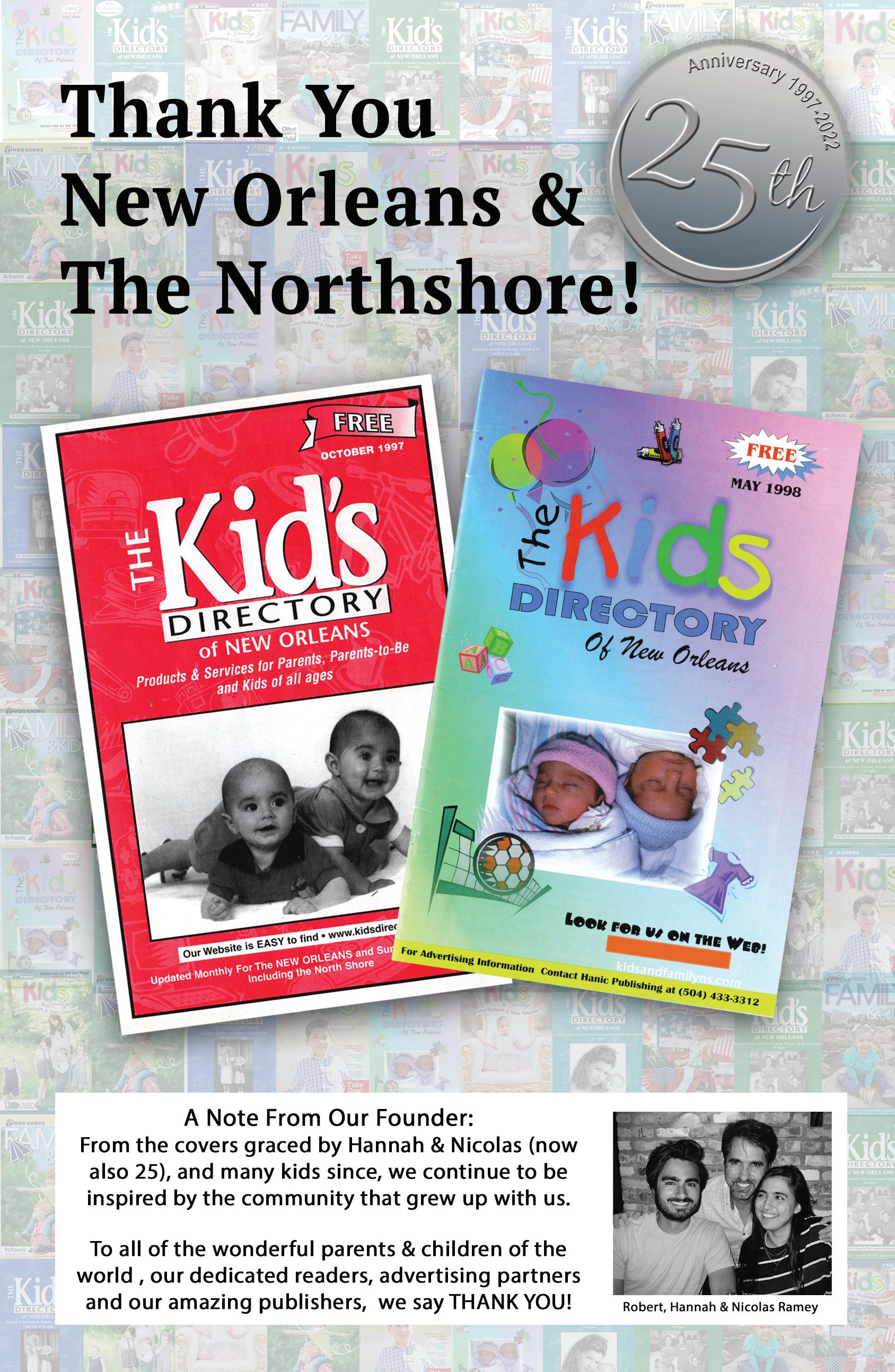 I’d like to recognize a few people for bringing to life this big, beau tiful brand. First, a huge thank you to Allen and Elizabeth Heil. For two decades you passionately steered Kids & Family Northshore and I am eternally grateful for our chance meeting. Without you, your wisdom, love and support I would not be writing this today. Second, a heartfelt thank you to Toni Landeche. You have one of the biggest hearts and as the publisher of Kids & Family New Orleans for two decades, you have been an inspiration to many and particularly now to me. I hope you all know how proud I am to have both of you as mentors but most importantly as friends. Special thanks to Robert Ramey who’s patience and kindness has been unwavering and to Susan Erickson, who has been with us since the beginning and often wears many hats, for working tireless ly behind the scenes as our creative designer. I’m looking forward to the many years ahead of us! Last but certainly not least, I’d like to acknowledge you, our loyal clients and readers. You’ve passionately supported us and so we toast to you as we look forward to embrac ing the next 25 years!