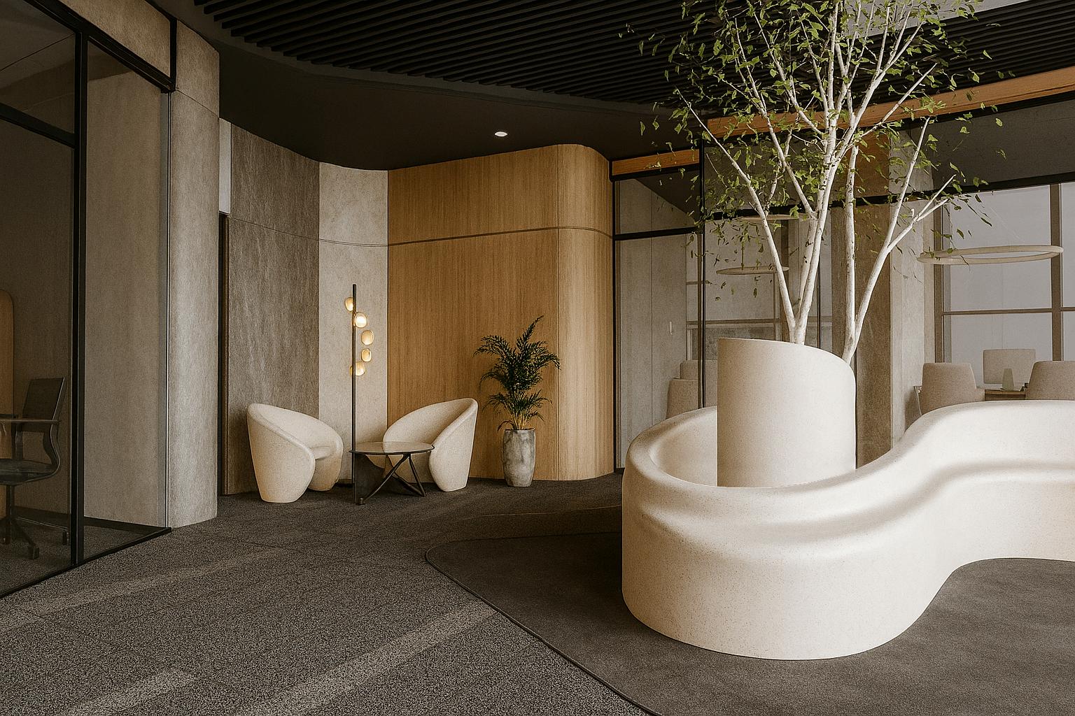 Set within the iconic Opus Tower by Zaha Hadid, this office interior draws directly from the tower’s sculptural form and fluid geometry. The design seeks to honour the architectural vision while crafting a human-centred workplace. Curved volumes and flowing partitions echo the façade’s contours, creating continuity between the building’s exterior and interior experience.