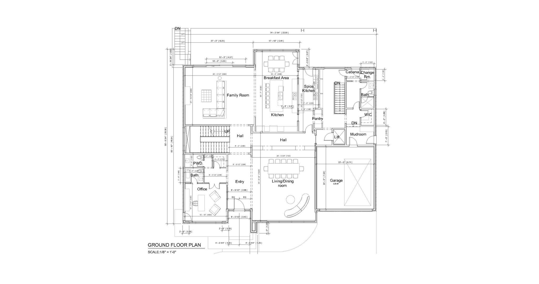 The ground floor accommodates the primary living spaces, including the office, formal living room, family area, and a carefully planned kitchen, all oriented to maximise natural light and views The double-height entrance and office spaces introduce a sense of grandeur and openness upon arrival, setting the tone for the residence’s architectural language.