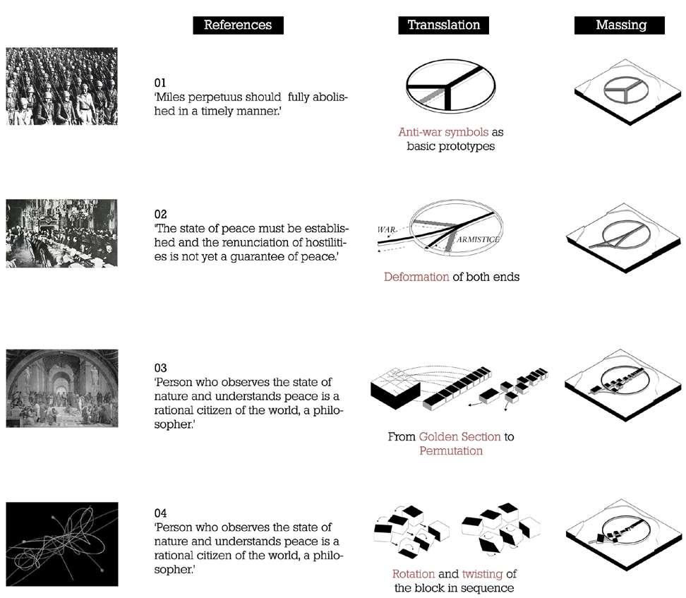 The space comes from the original text of the statements in Permanent Peace, during the process of translation, the methodlogy of typology, and some basic opreation to forms, using designs both in plan and section to implied the text.