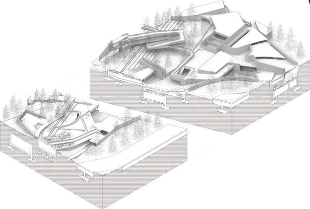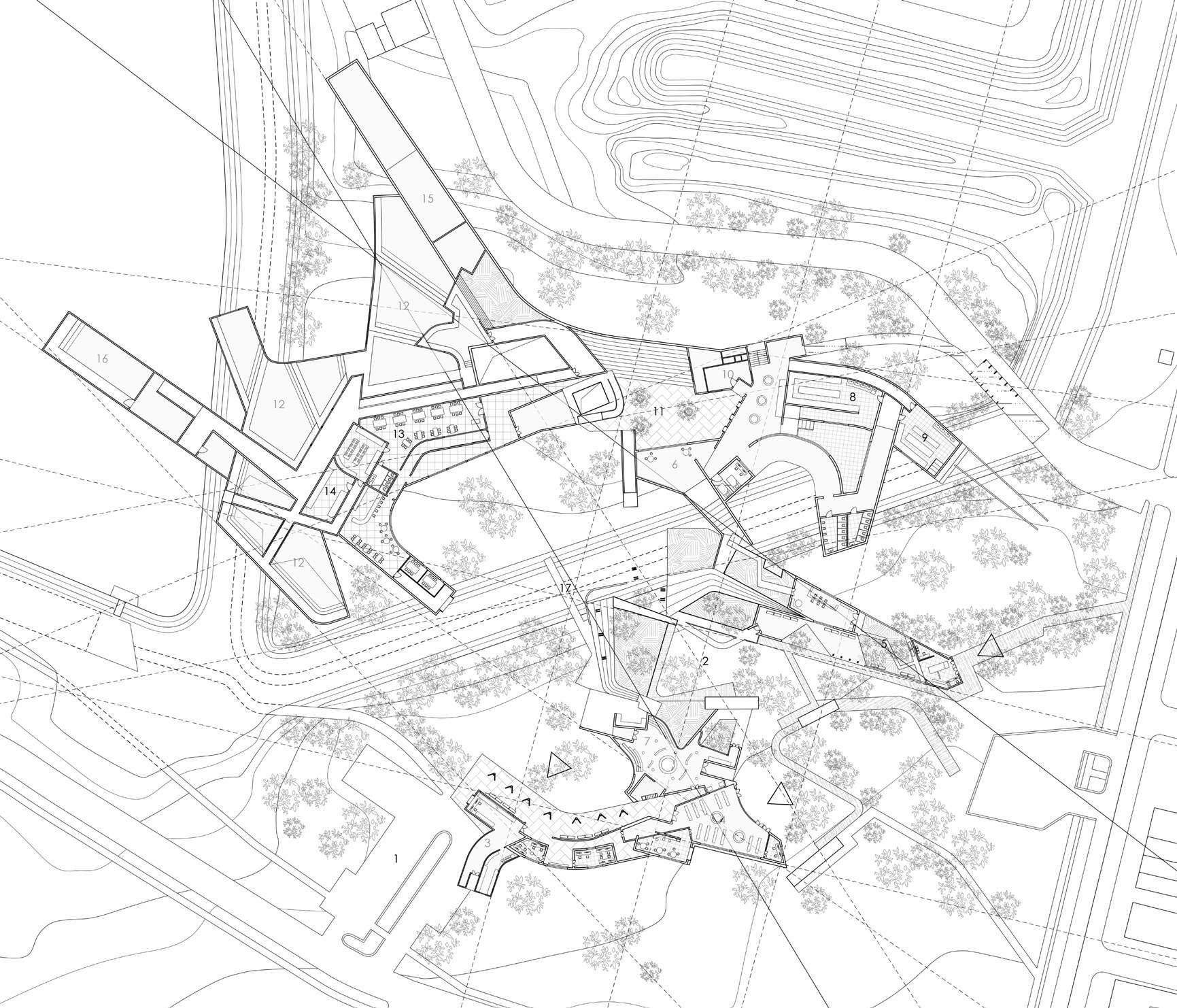 Thetwolinesrepresenthumanconflictandtheeffortstoresolveit.Theconflictispresented in three pavilions and the two conference halls represent the solutions to the conflict. The two lines collide and intersect, thus pointing to the direction of permanent peace