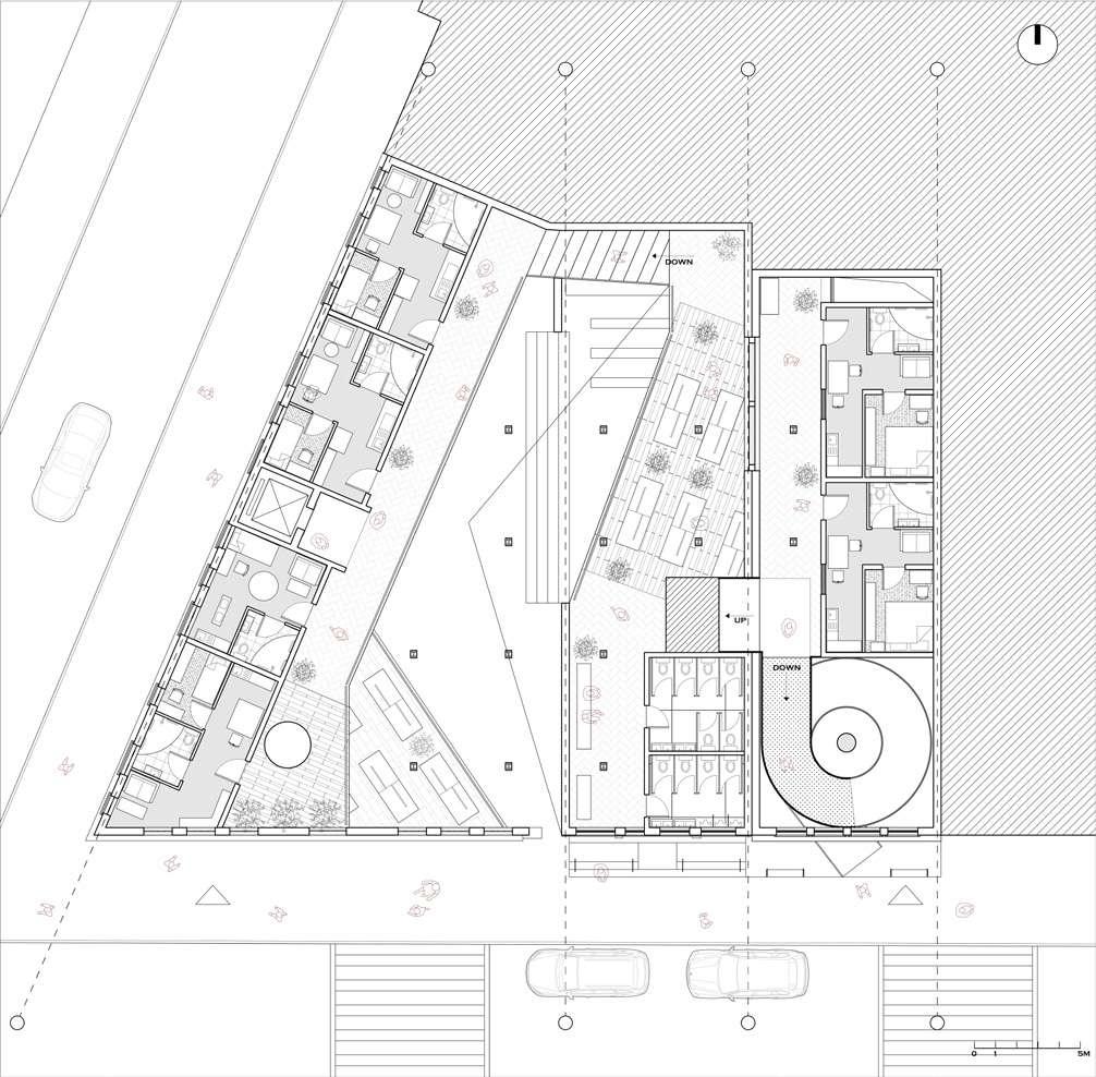 Turning the line into variety of forms and programs, such as green balcony, fire stairs, shared gallery, shared studios and two elevators. Also using a huge sparow stairs as facade signature elements
