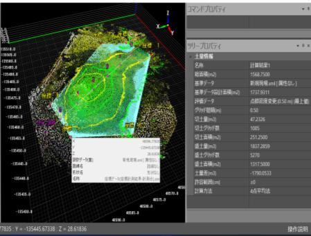 Figure8.Point-cloudanalysisinterface forNishi-ŌtsukaKofun.Sectionalprofiles andcontourmapswereproducedfrom thecapturedpointcloud,andearthwork volumes(cut–filldifference)were calculated(fillsurplus:approx.1,790m³).