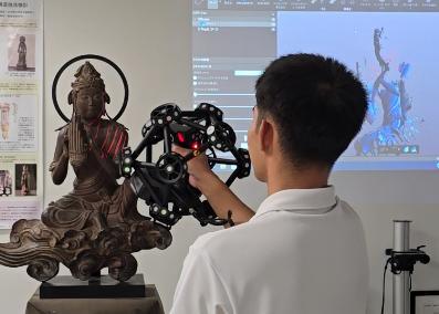 Figure21.Hands-onexperienceofthreedimensionalmeasurementattheInstitute ofHistoricalStudies,OtemaeUniversity. Studentsexaminedthestructureofa3D scannerusedincultural-property investigationandconfirmedthe measurementprocess,understanding thathigh-precisiondigitalrecordingforms afoundationforheritagetransmission andpreservation.