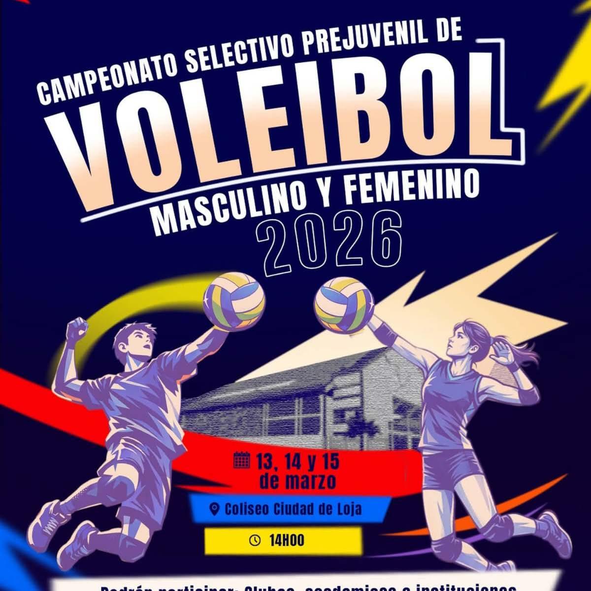 ste 13, 14 y 15 de marzo, a las 14:00, en el Coliseo Ciudad de Loja, se efectuará el Campeonato Selectivo Prejuvenil de Voleibol Masculino y Femenino 2026. Podrán participar clubes, academias e instituciones que deseen demostrar su nivel competitivo en la provincia.
