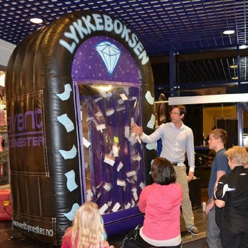 Prøv deg i cashbox og vinn gavekort fra Horisont! Her stiller du deg i boksen og prøver å fange lapper som svever rundt deg Lykke til!