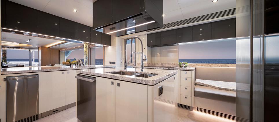 Another inviting exterior area has been designed for the foredeck, which features a U-shaped dinette and a sunpad for three with cupholders and atmosphere lighting. is area can be protected with a custom foredeck shade system. e FD92’s tri-deck design allows for a helm, L-shaped seating, sunpad and a bar equipped with a fridge and icemaker to be positioned on the uppermost deck. e Rock is the rst Horizon yacht for the experienced owners, who plan to cruise the U.S. East Coast, Florida Keys and Bahamas with family and friends.