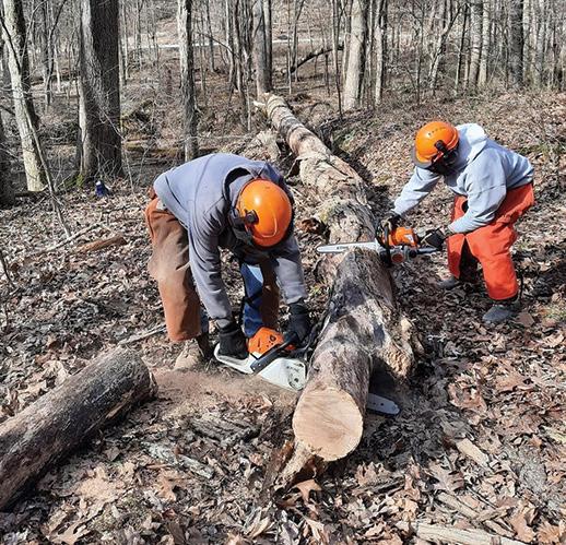Our Over the Hill Gang finally managed to get something done! Of the first three work days planned, two were rained out (except for a partial day when a few people installed new mounting blocks and cleared around the tie rails at the cemetery), and another was frozen out. We finally got to the trails on Feb. 15. Of course, we had a rather abrupt start to the day as we pulled into camp and found a big tree partially obstructing the driveway. We spent about 90 minutes clearing that before we could even get to the trails! We also got Moonlit Vista cleared, including both paths to the lake, and new tie rails installed at the Buflod Overlook. One of the cross rails had been broken by a falling tree, and the other was showing signs of wear, so both were fixed. I’m including photos this month from those jobs taken by Barb Pfantz.