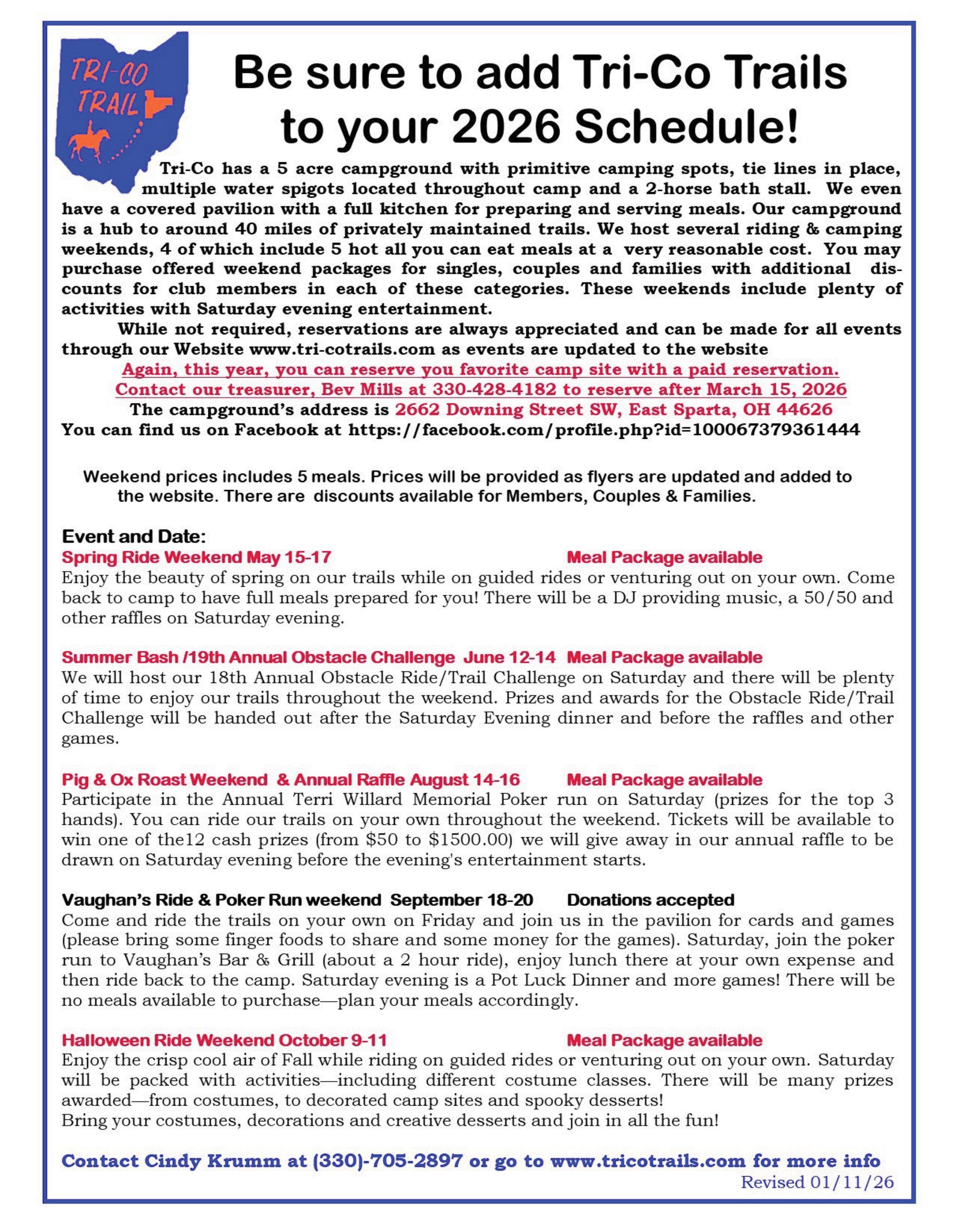Our February meeting will be our annual chili cook-off and Deer Creek State Park update from Bob Kruse, Deer Creek Service Manager. The horse campground is open. There is a new latrine and water for horses! There are gravel parking pads for the campsites. Now, we just need horsemen to reserve and