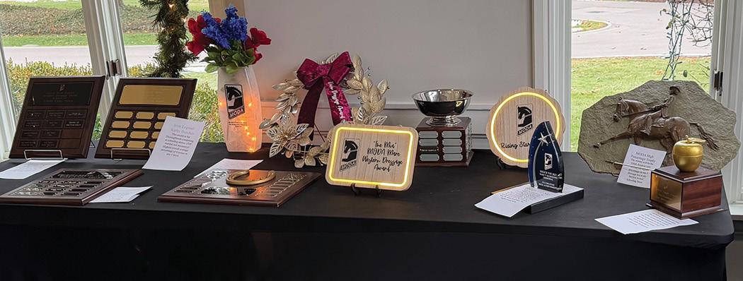 MODA members gathered on a snowy December 13, 2025, at the Brookside Country Club in Columbus Ohio. The afternoon event included a delicious luncheon, a slide show of members at competitions throughout the year, many wonderful, donated raffle baskets, presentation of the MODA grant winners, and presentation the rider and horse achievements and the year-end awards. Thank you to all who donated baskets, bought tickets for the baskets, sponsored or worked to provide and present the awards, worked to make the banquet happen, all who braved the snow to celebrate together and Brookside for the beautiful space. Our sponsors and volunteers make it all happen! All the year end award results are found on midohiodressage.com. Please send in your 2026 MODA membership so you can join us in another busy show season in 2026. Sign up to volunteer, it is fun and rewarding. Need ideas how to volunteer, email