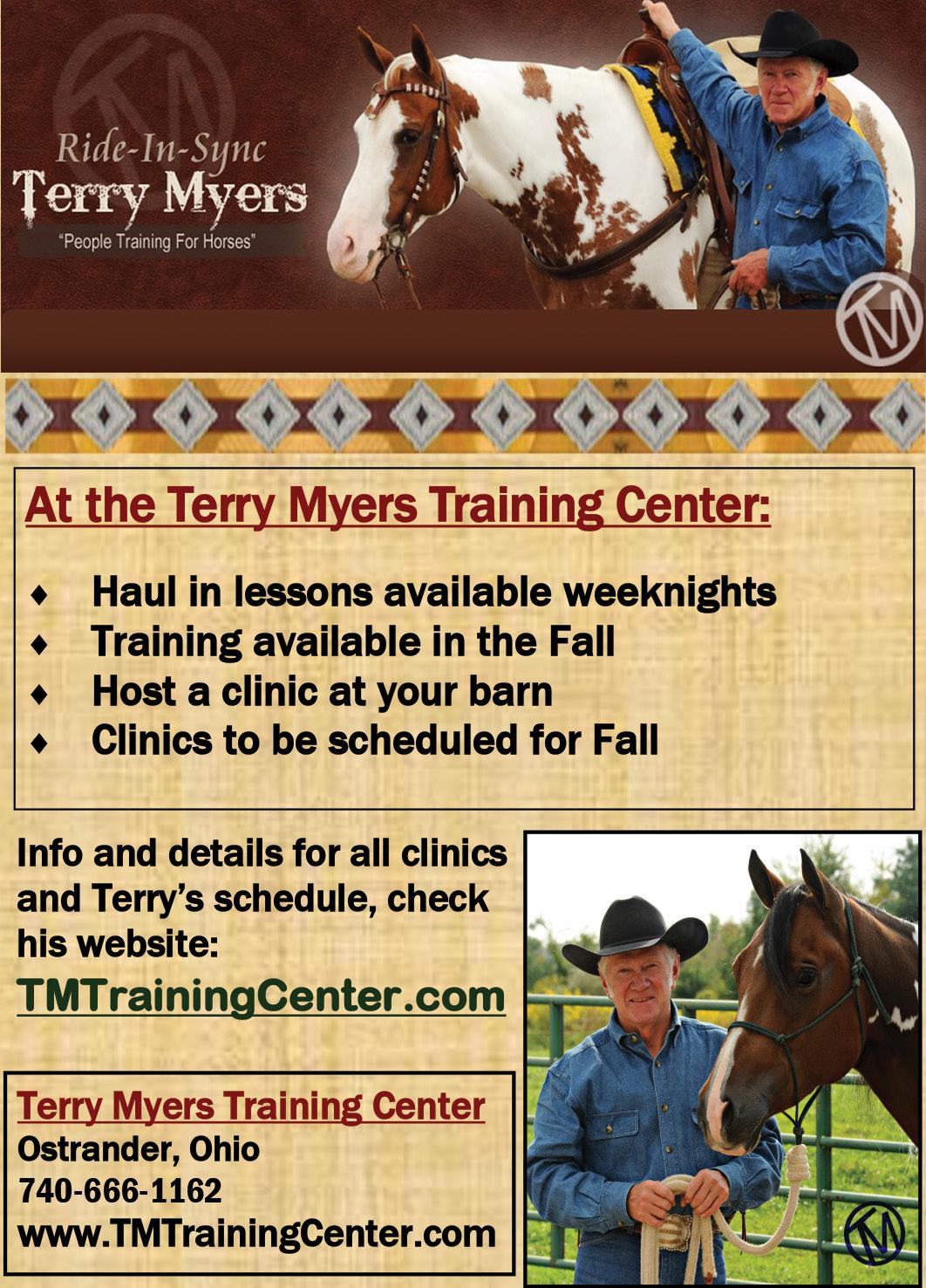 Terry Myers is a national clinician and champion horse trainer with a depth of knowledge developed from over 50 years in the horse industry. Myers has been a popular clinician at multiple expos in the U.S. and Canada. To learn more about Myers’ Ride-InSync methods as well as clinic and training services available, visit www.tmtrainingcenter.com or on Facebook.