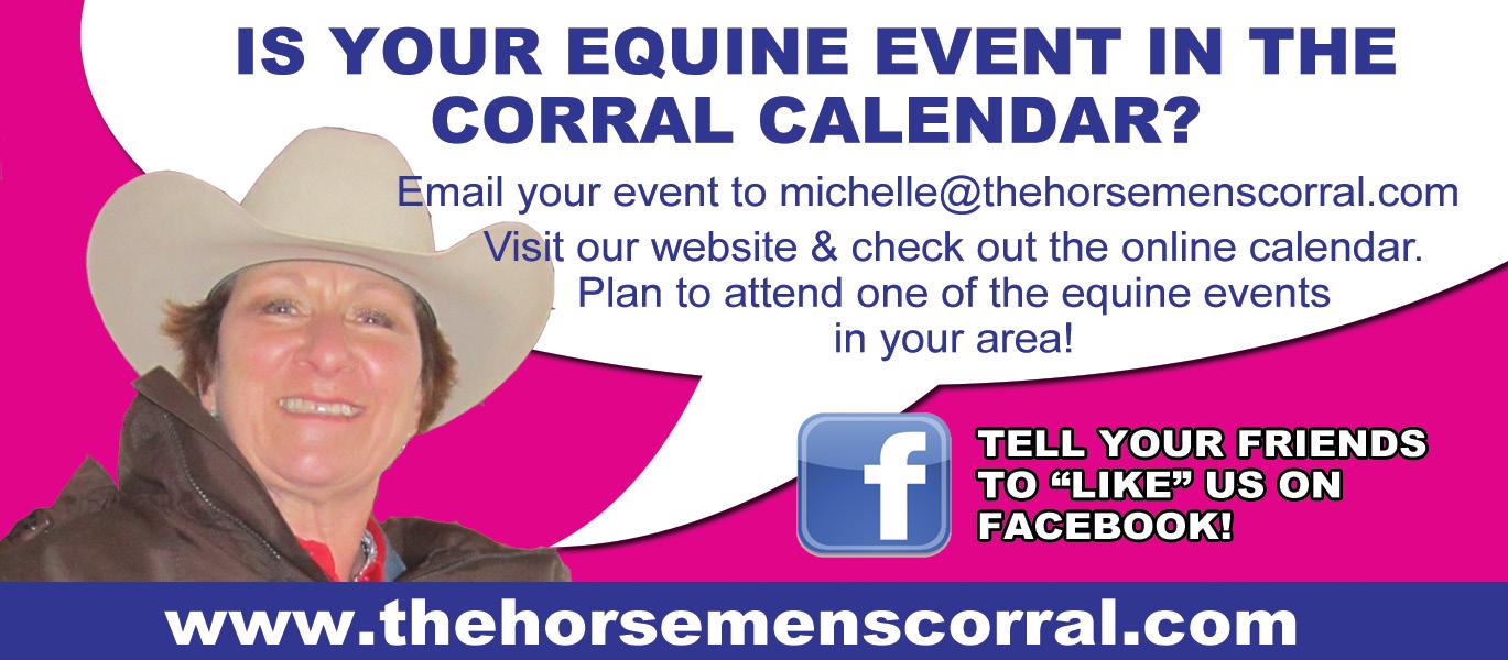 It is FREE to add your Equine Event to the Corral Calendar. Events will be added to the calendar in the magazine and added to our website. Email your event(s) to michelle@thehorsemenscorral.com with the following information: Name of Equine Event Date/Time of Equine Event Venue Name of where event will be held Address of venue Contact name and phone number You may include an email and website address also. www.thehorsemenscorral.com
