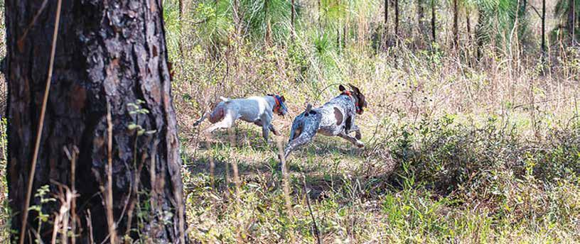 Pointing breeds such as the American Brittany and German Shorthaired Pointer (GSP) are common versatile bird dogs used to hunt quail. “The Brittany is a close-working pointing dog with natural hunting and retrieving ability,” as quailfor ever.org states, and the GSP “should range and hunt within a comfortable distance from the hunter. They work well with other dogs in the field and should honor instinctively.” En glish cockers are also finding favor on southeastern US quail plantations as flushing dogs. However, the favorable bird dog athlete leading quail hunts in the south are the English Point ers. Known for having a tremendous amount of speed, they are true competitors. The English Pointer champions over others at Pointing Field Trials.