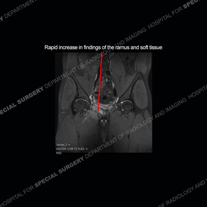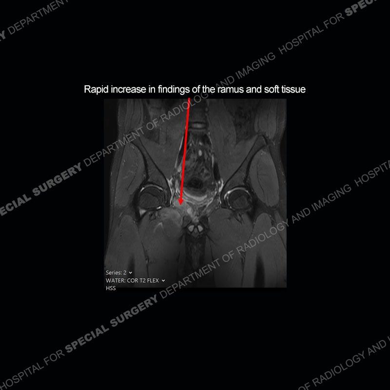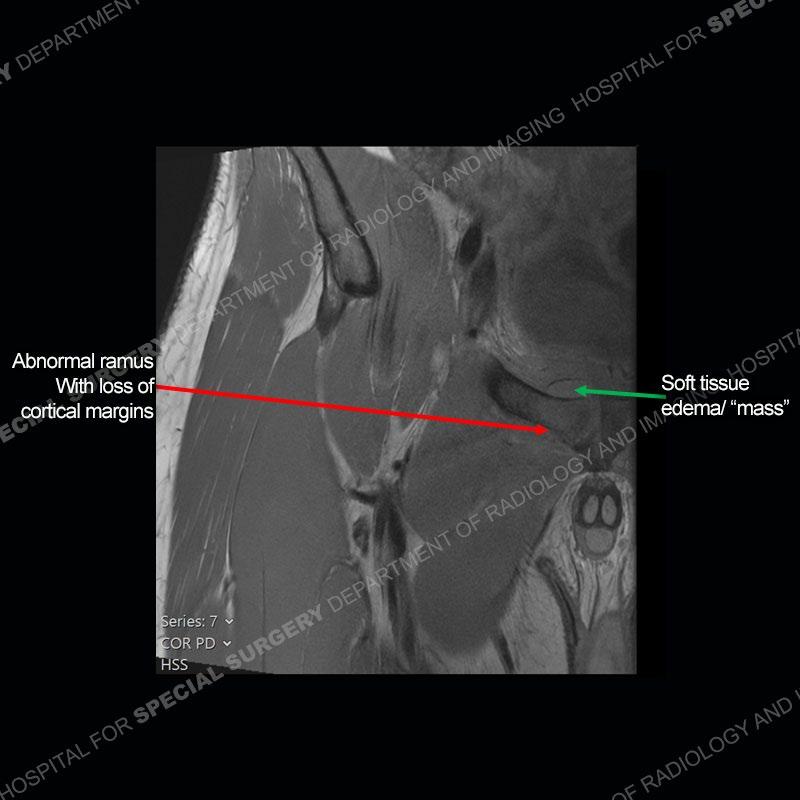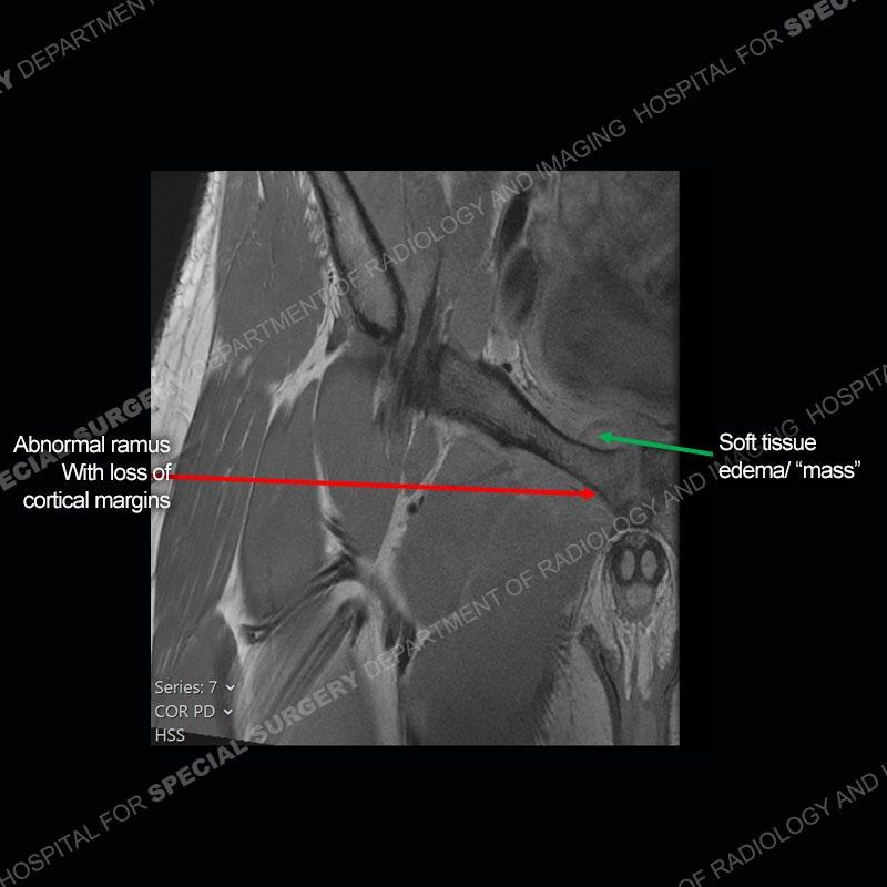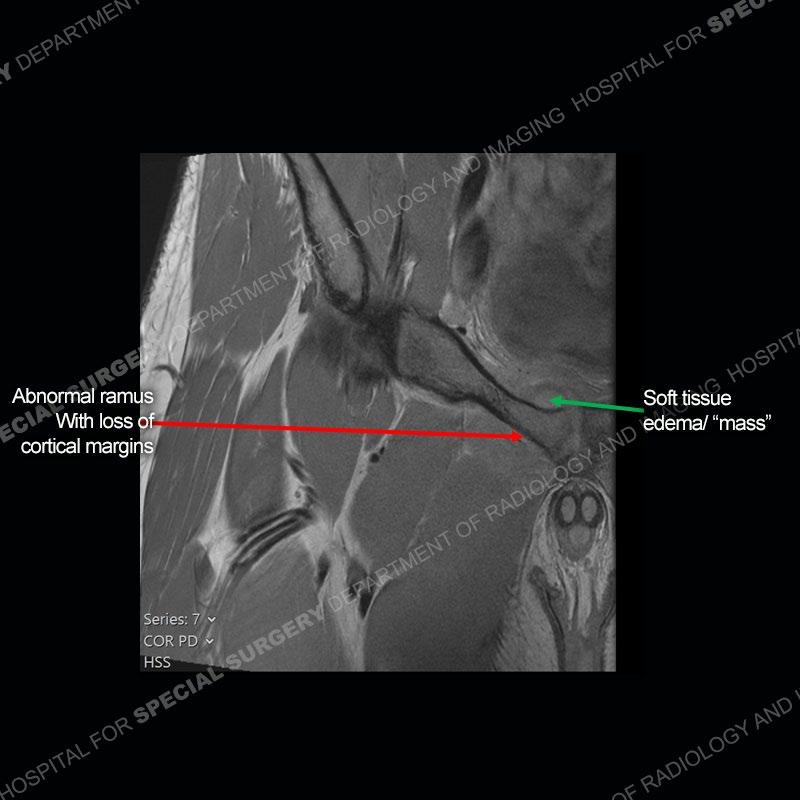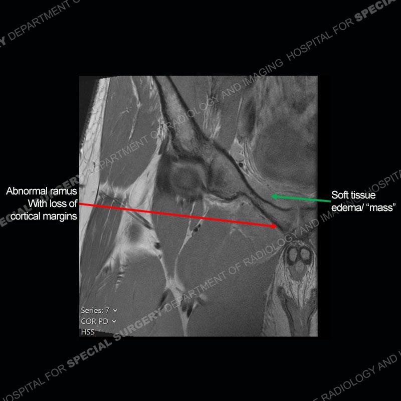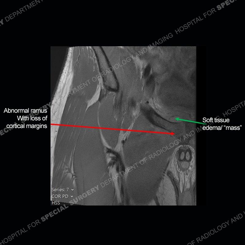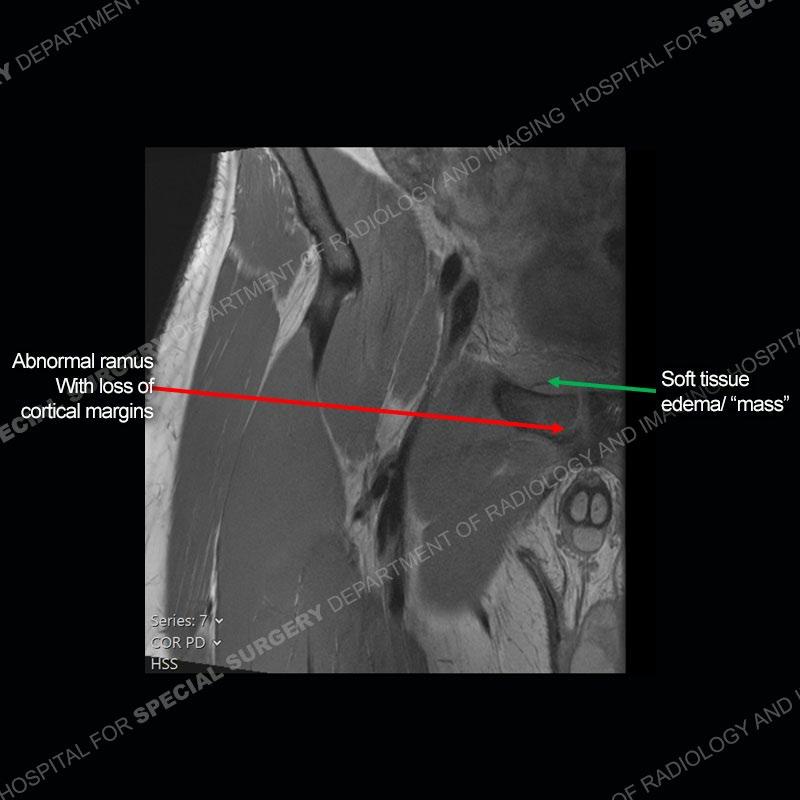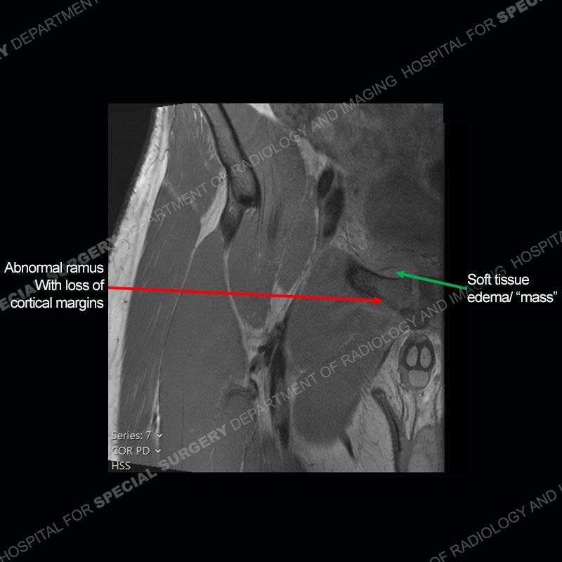 This case was a bit surprising to all involved given that the young man is otherwise in good health and extremely active in sports. The original thought was this case was going to be an overuse injury or stress fracture. The pubic ramus with the adjacent physis acts as a metaphyseal equivalent and although not frequently thought of would be a reasonable location for infection/osteomyelitis. The first MRI was somewhat confusing as the process did not have an appearance of a stress injury or rectus adductor aponeurosis injury. The degree of edema of the bone and soft tissue together would be odd especially for a sports hernia process. Initially, the thought was of an aggressive process which could be infection or neoplastic. Particularly, the abnormal architecture of the inferior surface of the ramus looked like a destructive process.