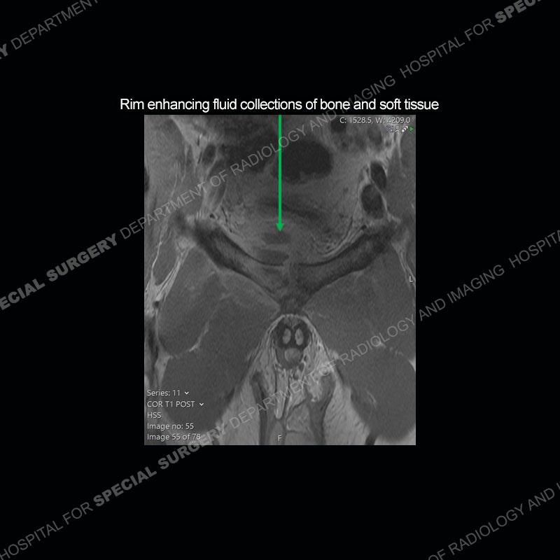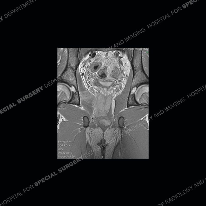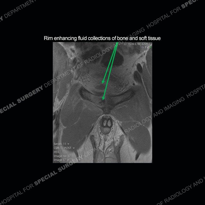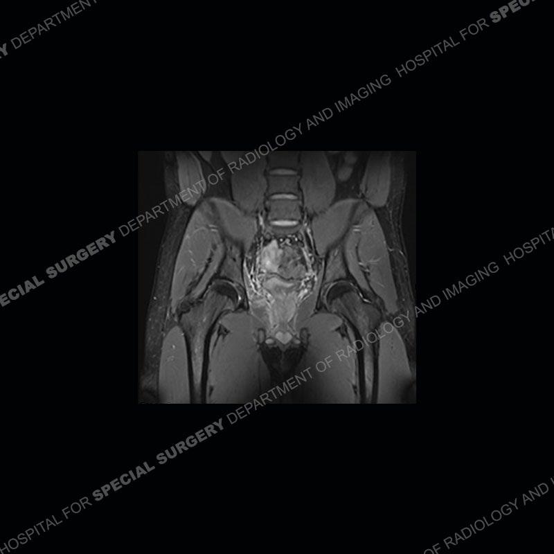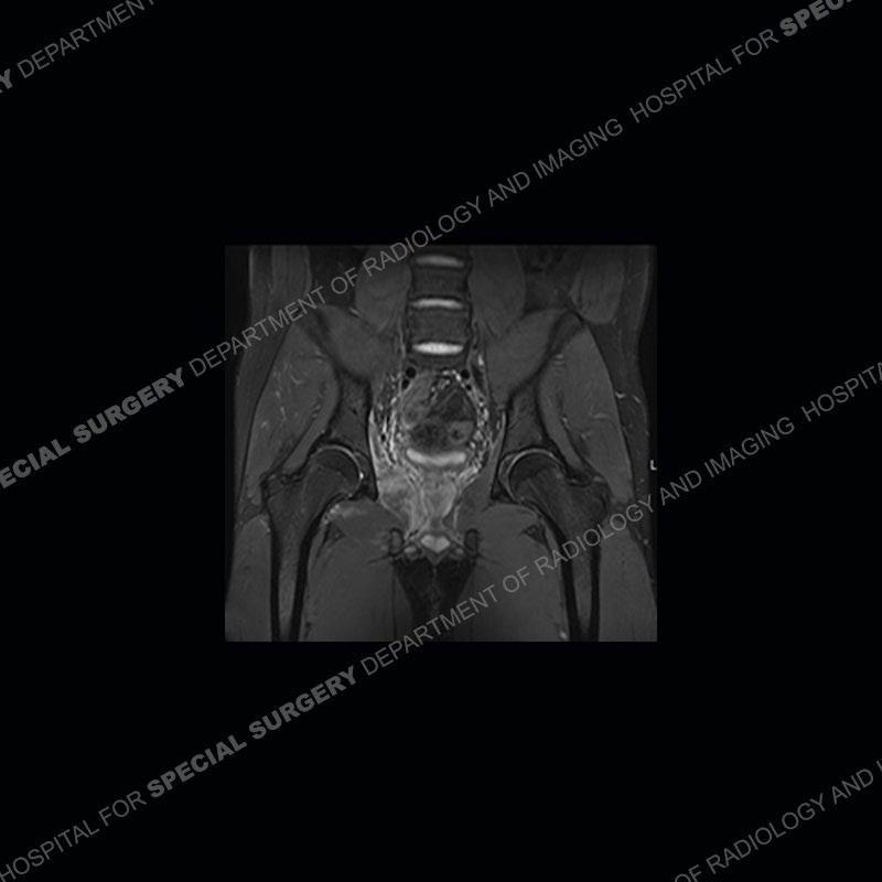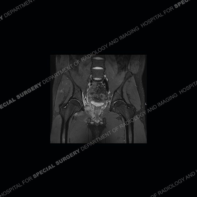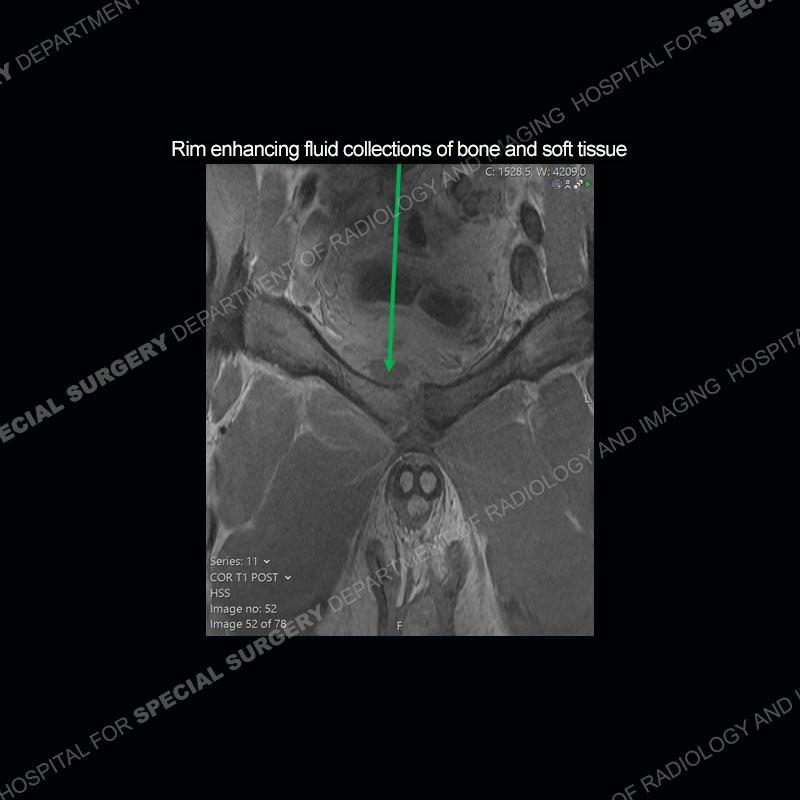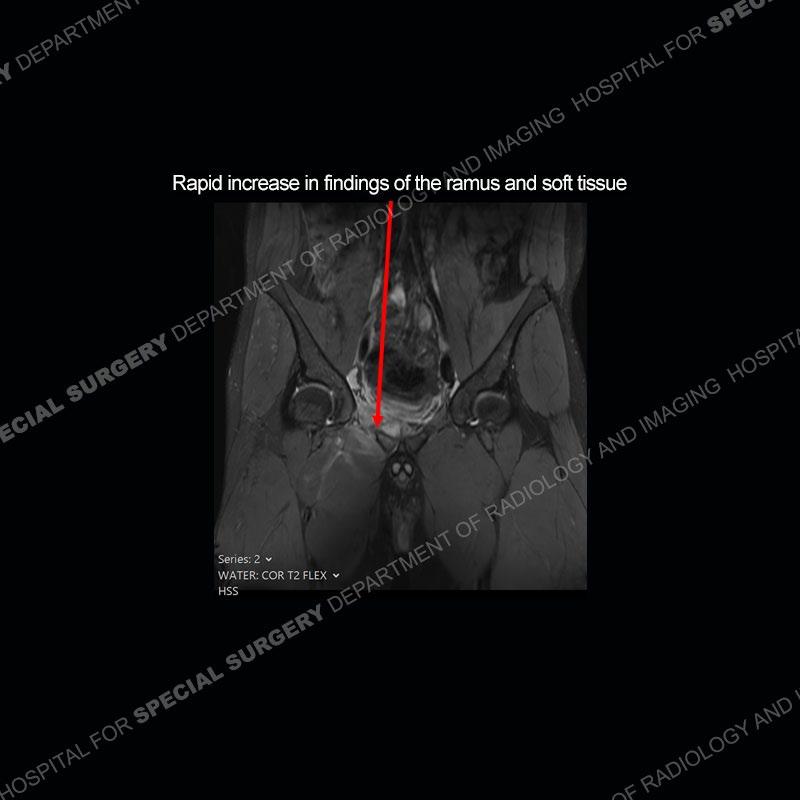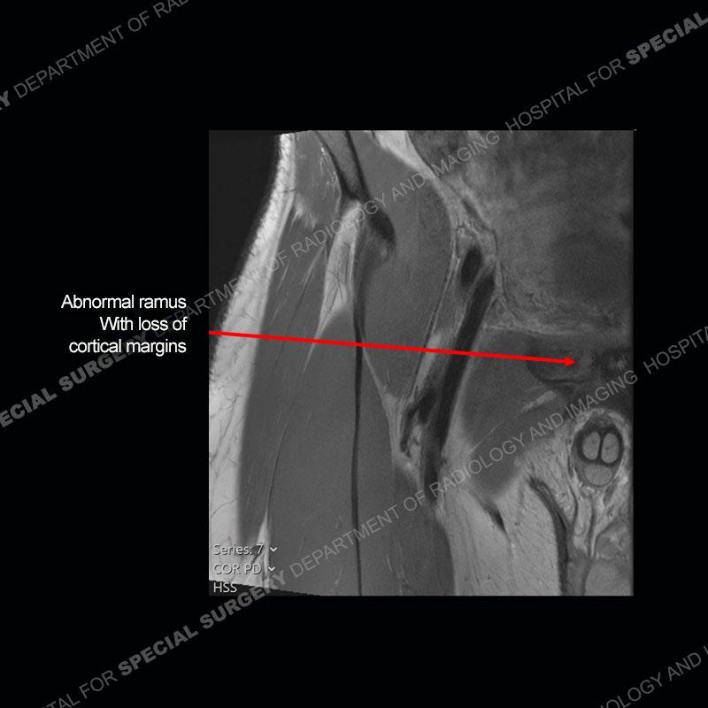 This case was a bit surprising to all involved given that the young man is otherwise in good health and extremely active in sports. The original thought was this case was going to be an overuse injury or stress fracture. The pubic ramus with the adjacent physis acts as a metaphyseal equivalent and although not frequently thought of would be a reasonable location for infection/osteomyelitis. The first MRI was somewhat confusing as the process did not have an appearance of a stress injury or rectus adductor aponeurosis injury. The degree of edema of the bone and soft tissue together would be odd especially for a sports hernia process. Initially, the thought was of an aggressive process which could be infection or neoplastic. Particularly, the abnormal architecture of the inferior surface of the ramus looked like a destructive process.