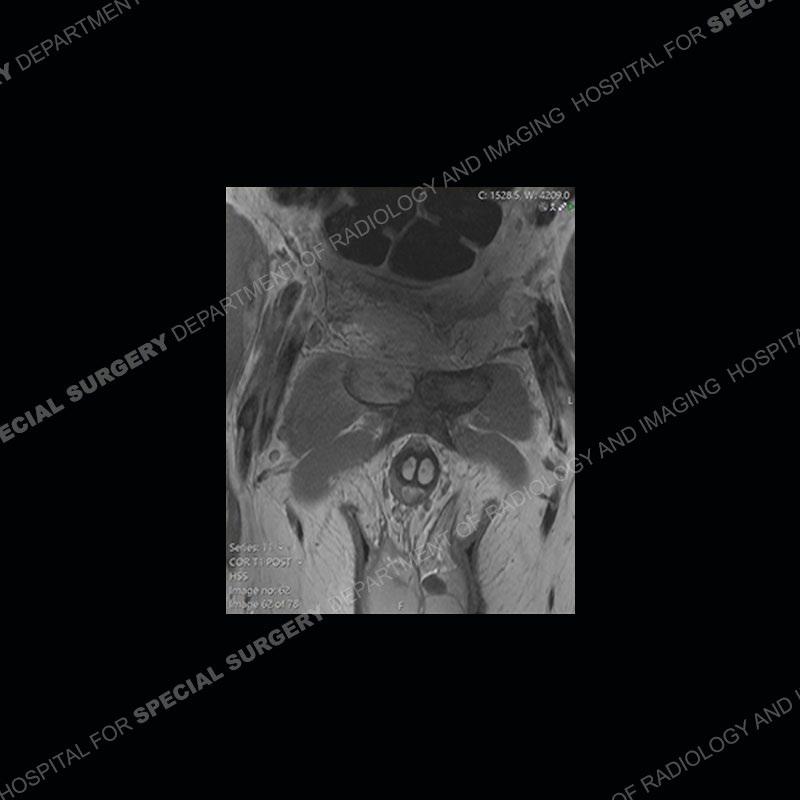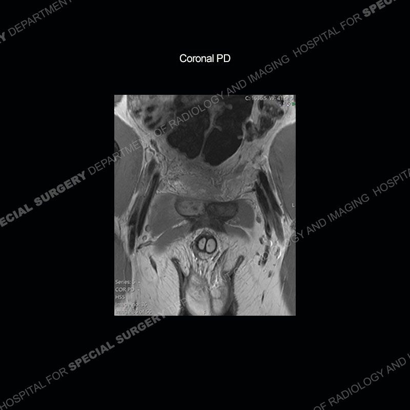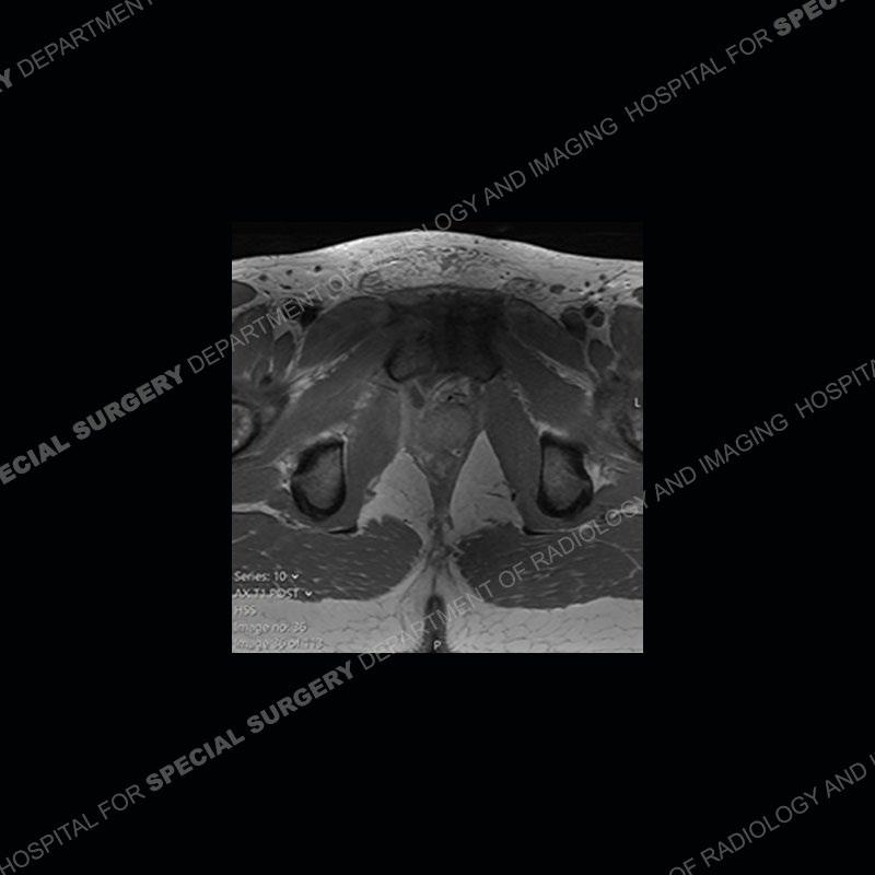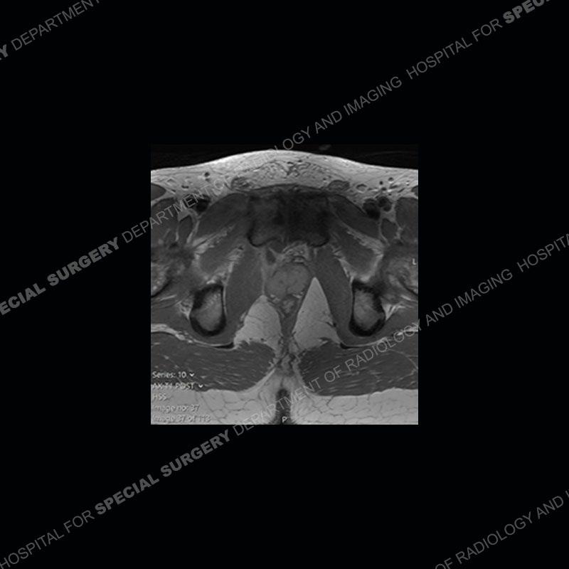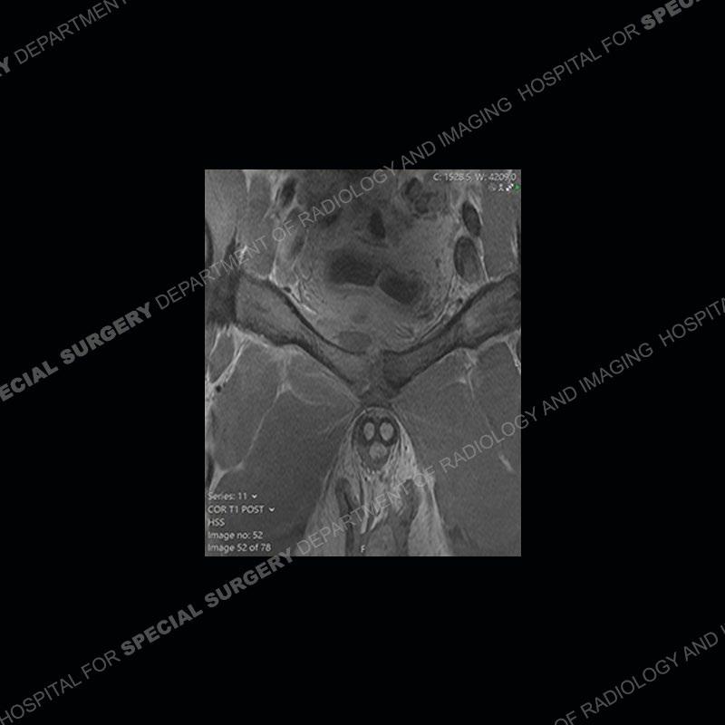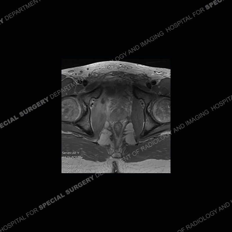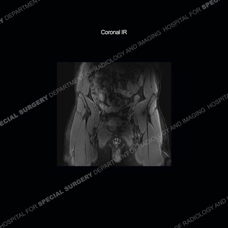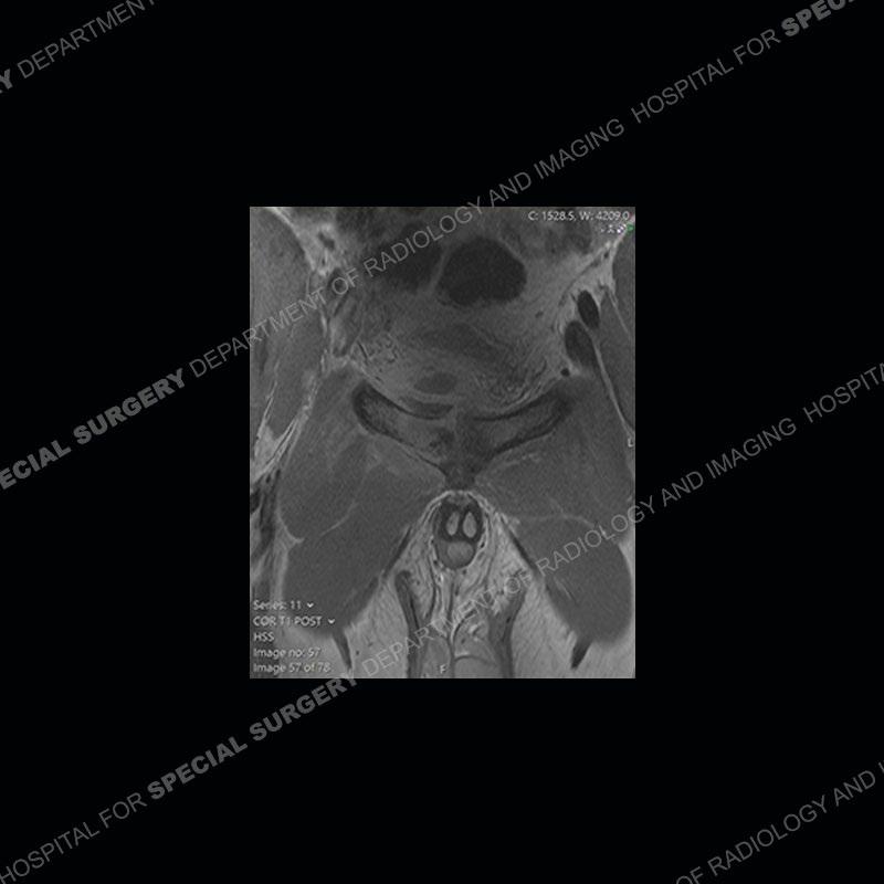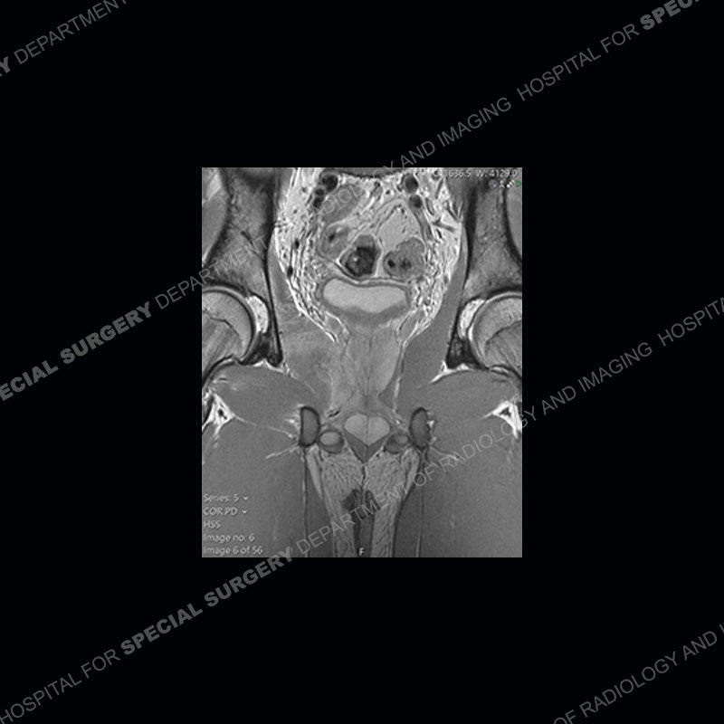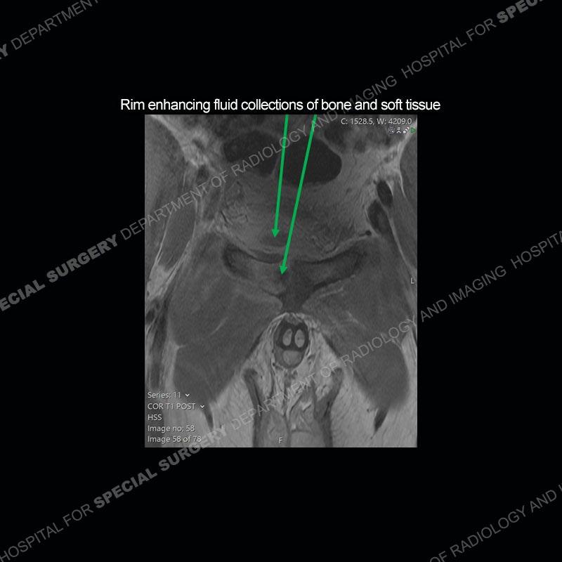 This case was a bit surprising to all involved given that the young man is otherwise in good health and extremely active in sports. The original thought was this case was going to be an overuse injury or stress fracture. The pubic ramus with the adjacent physis acts as a metaphyseal equivalent and although not frequently thought of would be a reasonable location for infection/osteomyelitis. The first MRI was somewhat confusing as the process did not have an appearance of a stress injury or rectus adductor aponeurosis injury. The degree of edema of the bone and soft tissue together would be odd especially for a sports hernia process. Initially, the thought was of an aggressive process which could be infection or neoplastic. Particularly, the abnormal architecture of the inferior surface of the ramus looked like a destructive process.