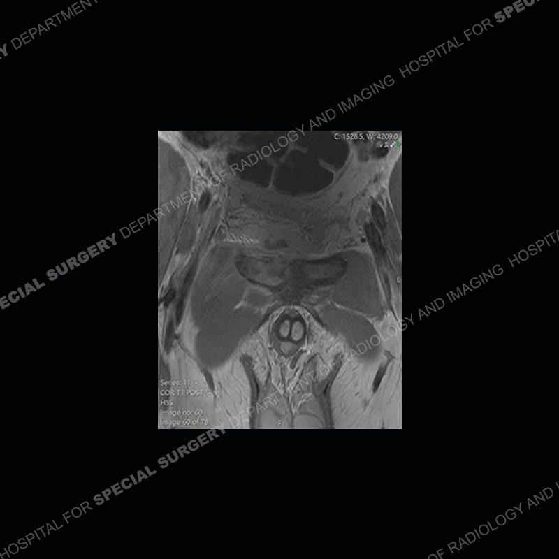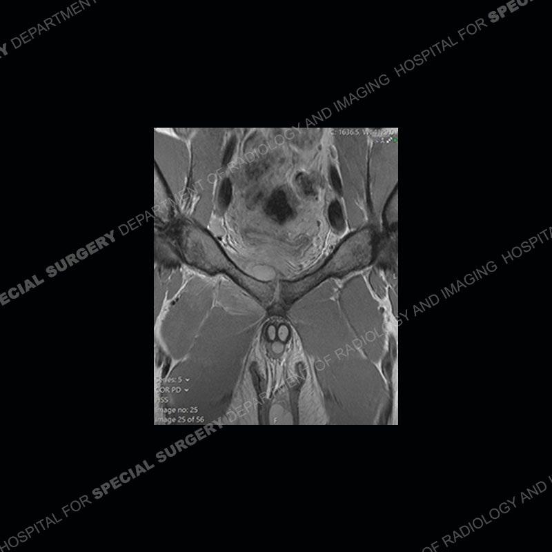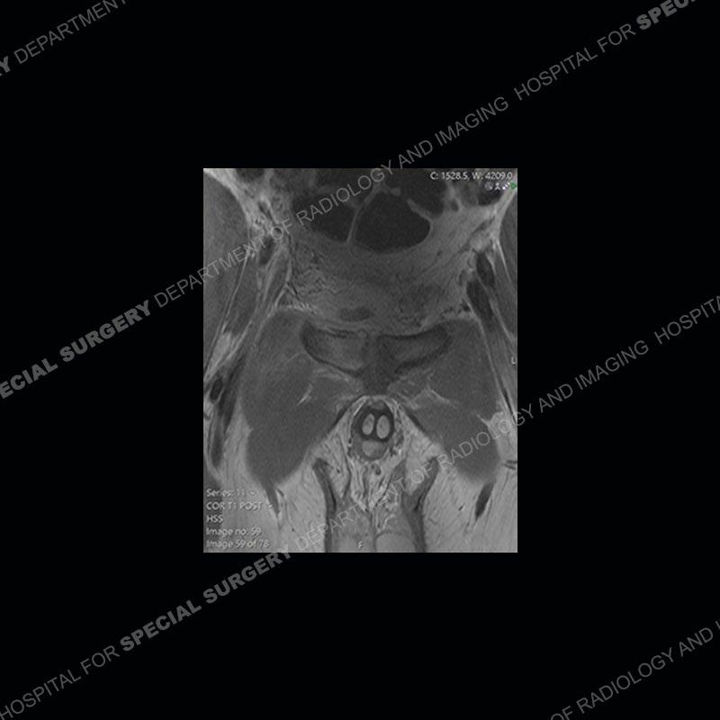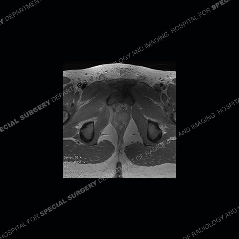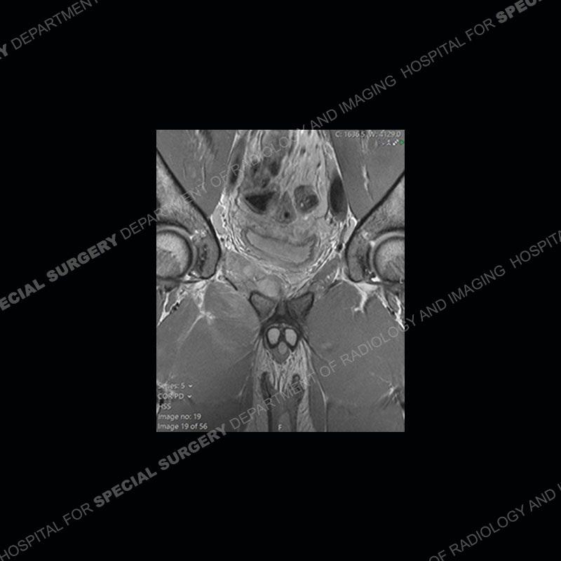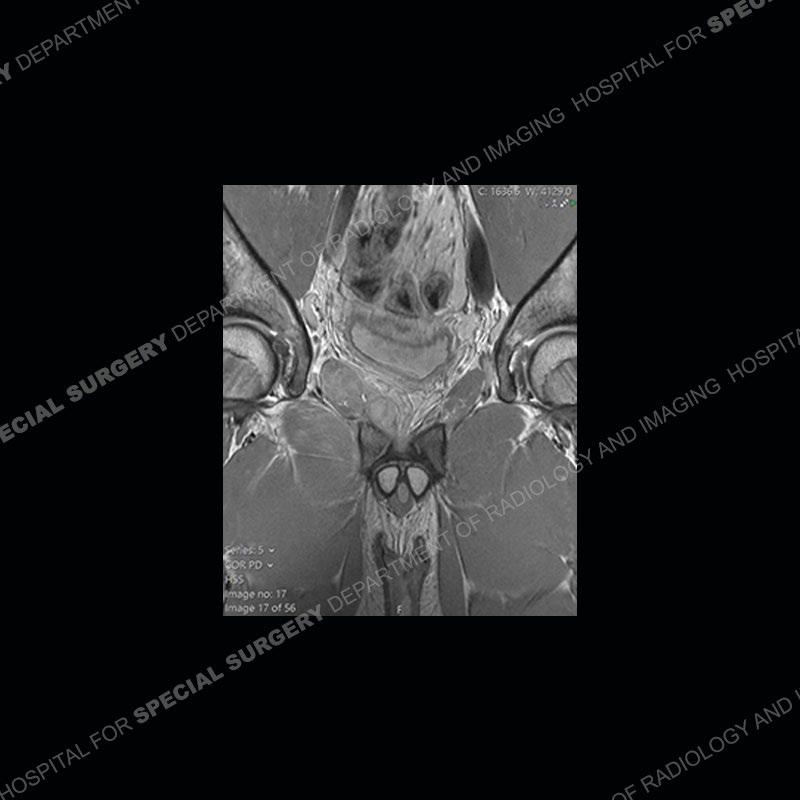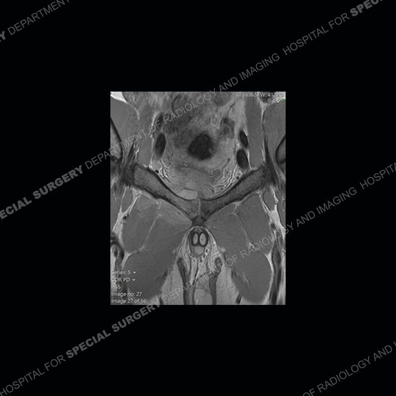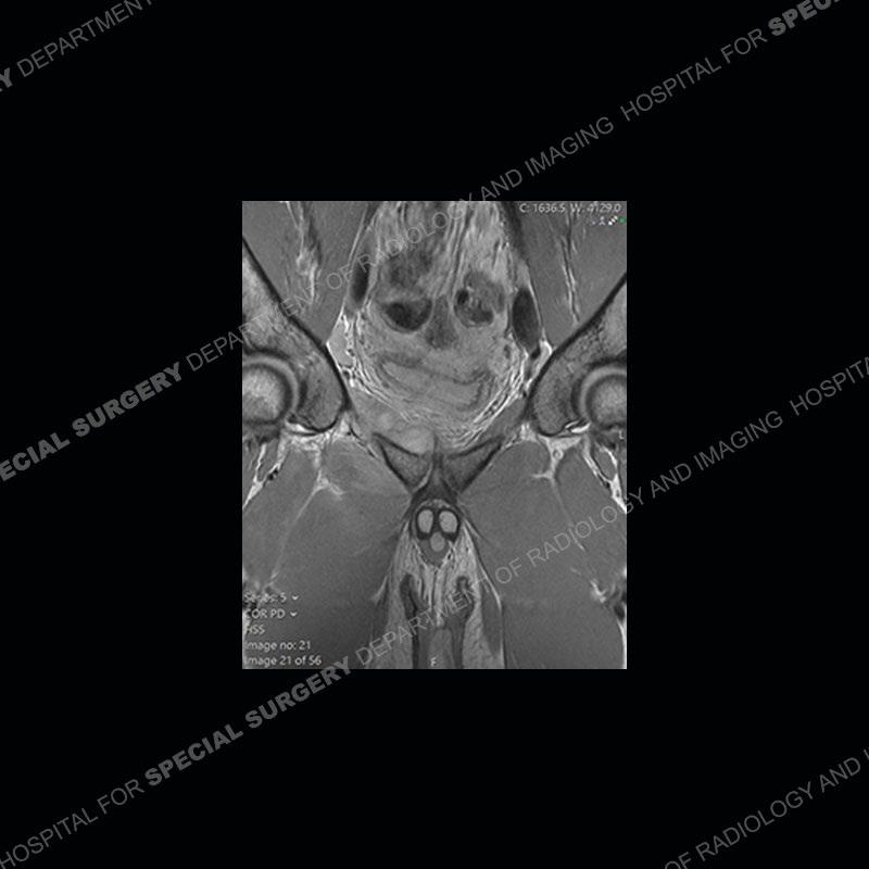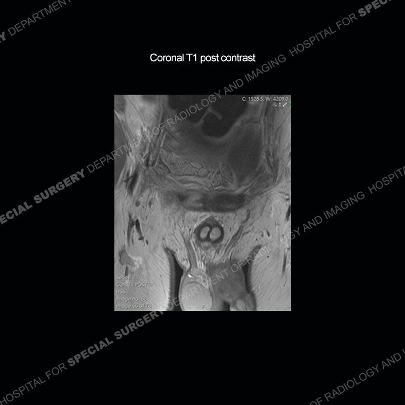This case was a bit surprising to all involved given that the young man is otherwise in good health and extremely active in sports. The original thought was this case was going to be an overuse injury or stress fracture. The pubic ramus with the adjacent physis acts as a metaphyseal equivalent and although not frequently thought of would be a reasonable location for infection/osteomyelitis. The first MRI was somewhat confusing as the process did not have an appearance of a stress injury or rectus adductor aponeurosis injury. The degree of edema of the bone and soft tissue together would be odd especially for a sports hernia process. Initially, the thought was of an aggressive process which could be infection or neoplastic. Particularly, the abnormal architecture of the inferior surface of the ramus looked like a destructive process.