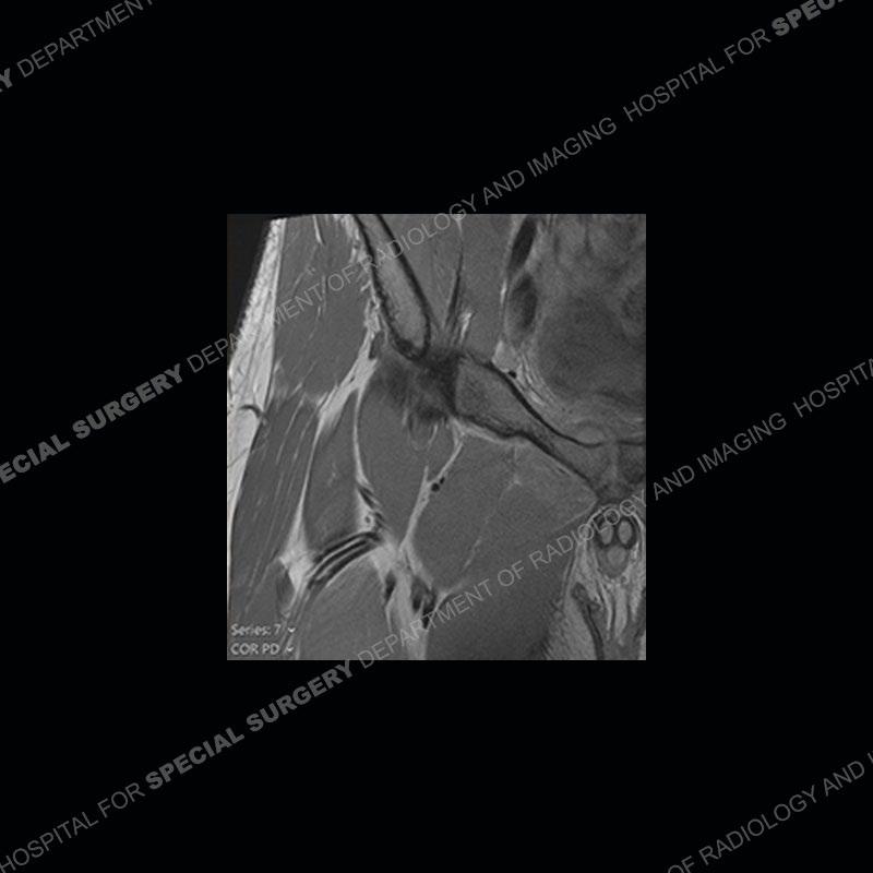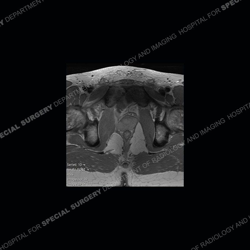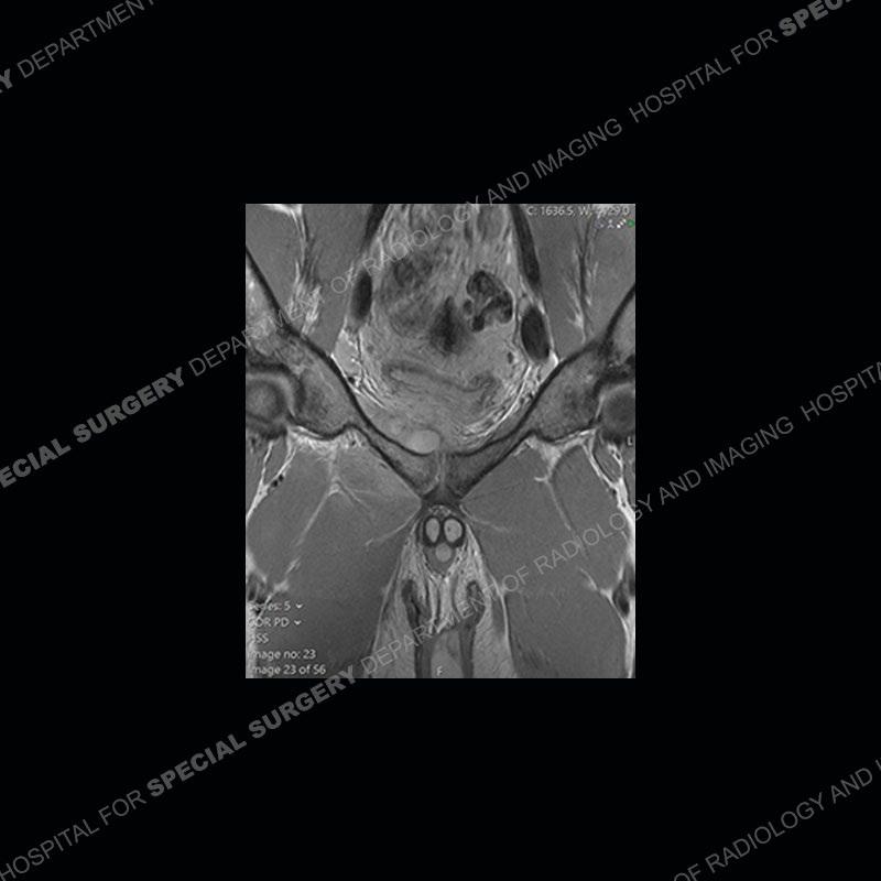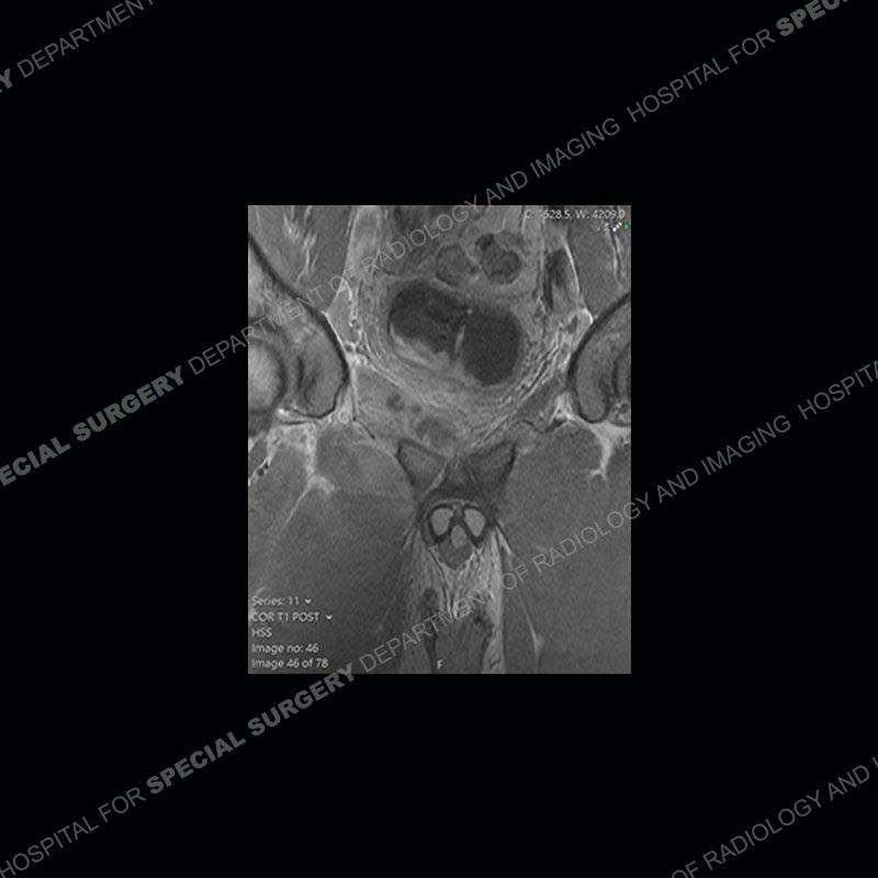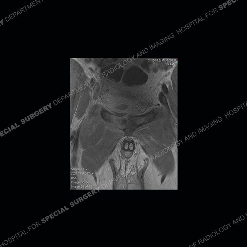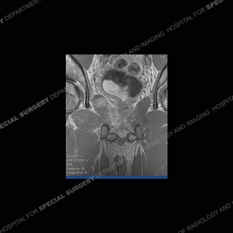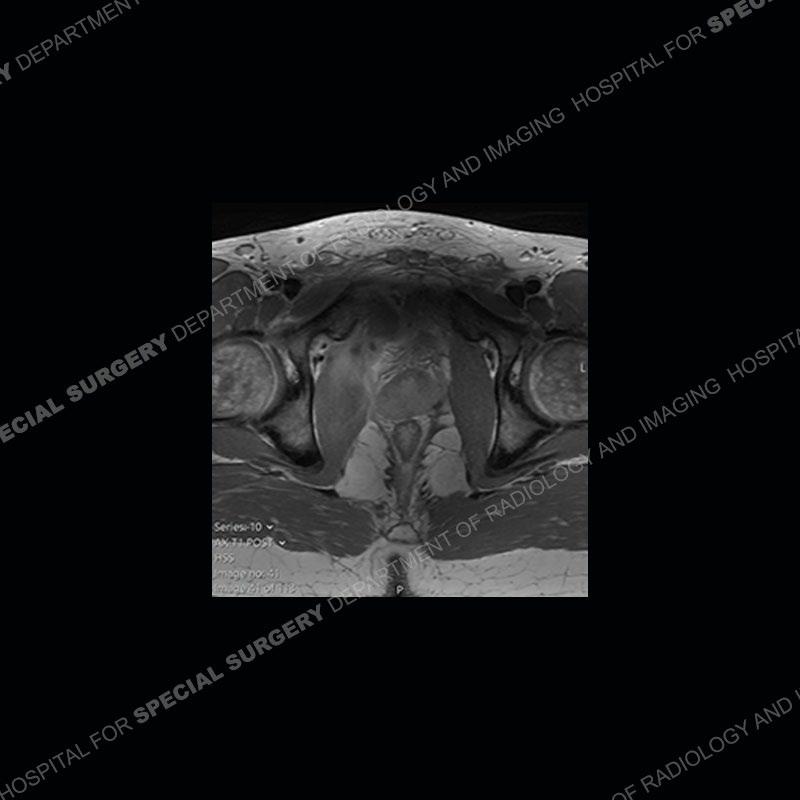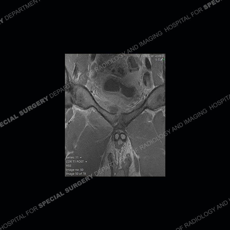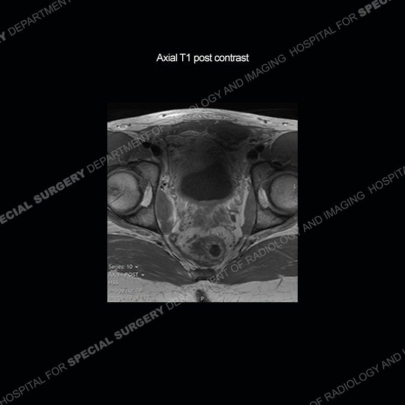 This case was a bit surprising to all involved given that the young man is otherwise in good health and extremely active in sports. The original thought was this case was going to be an overuse injury or stress fracture. The pubic ramus with the adjacent physis acts as a metaphyseal equivalent and although not frequently thought of would be a reasonable location for infection/osteomyelitis. The first MRI was somewhat confusing as the process did not have an appearance of a stress injury or rectus adductor aponeurosis injury. The degree of edema of the bone and soft tissue together would be odd especially for a sports hernia process. Initially, the thought was of an aggressive process which could be infection or neoplastic. Particularly, the abnormal architecture of the inferior surface of the ramus looked like a destructive process.
