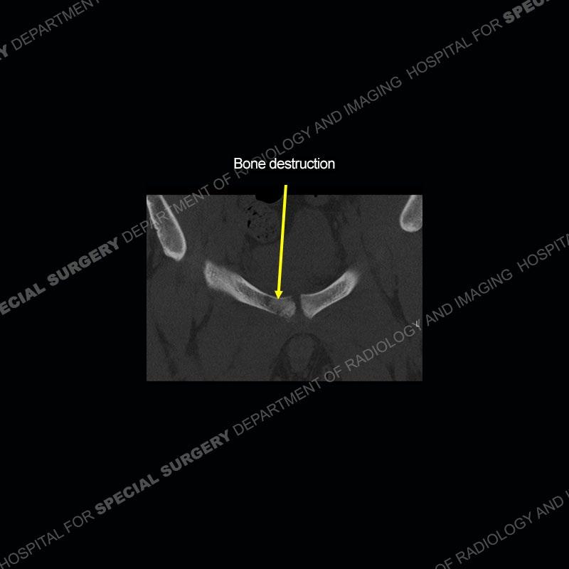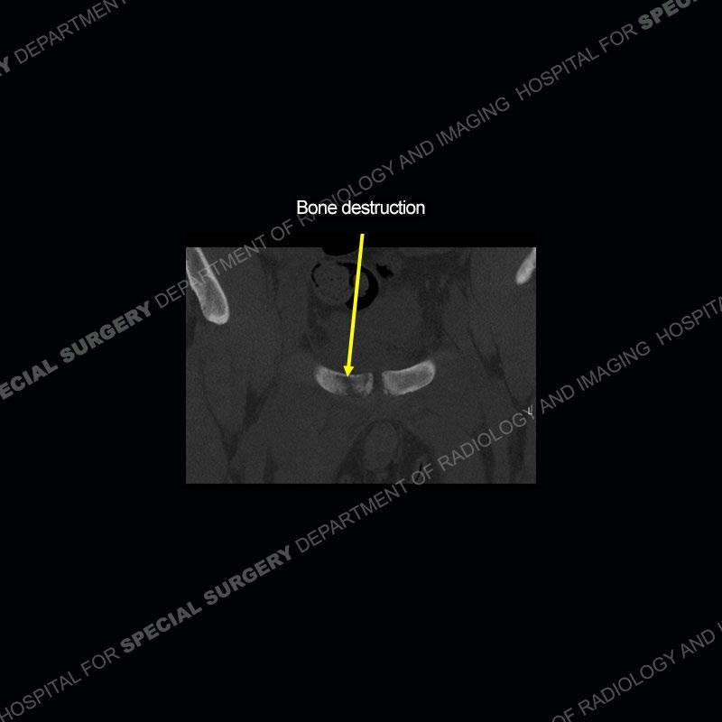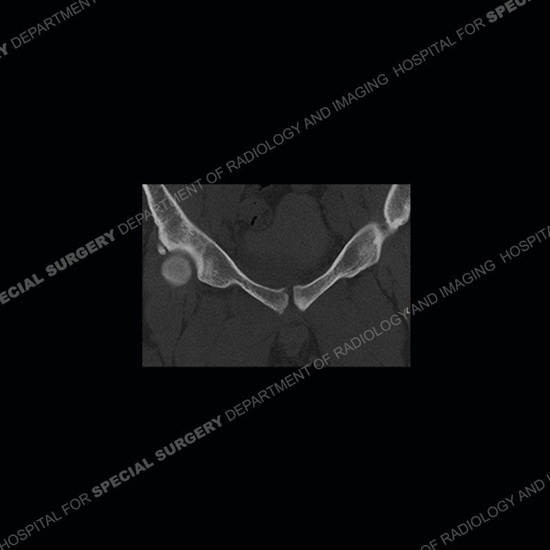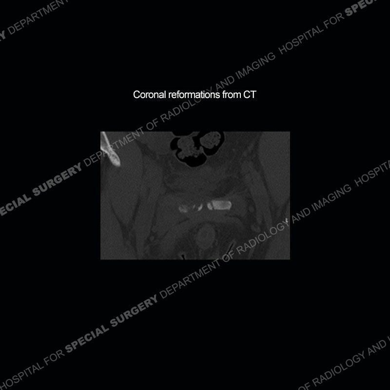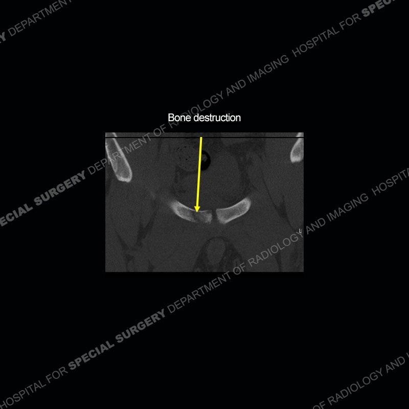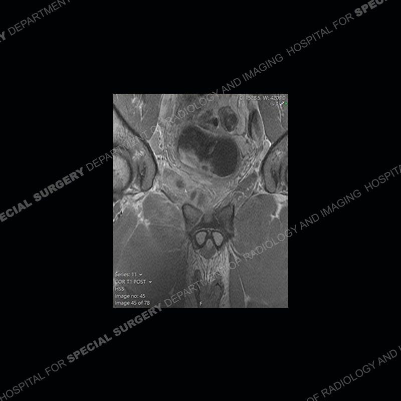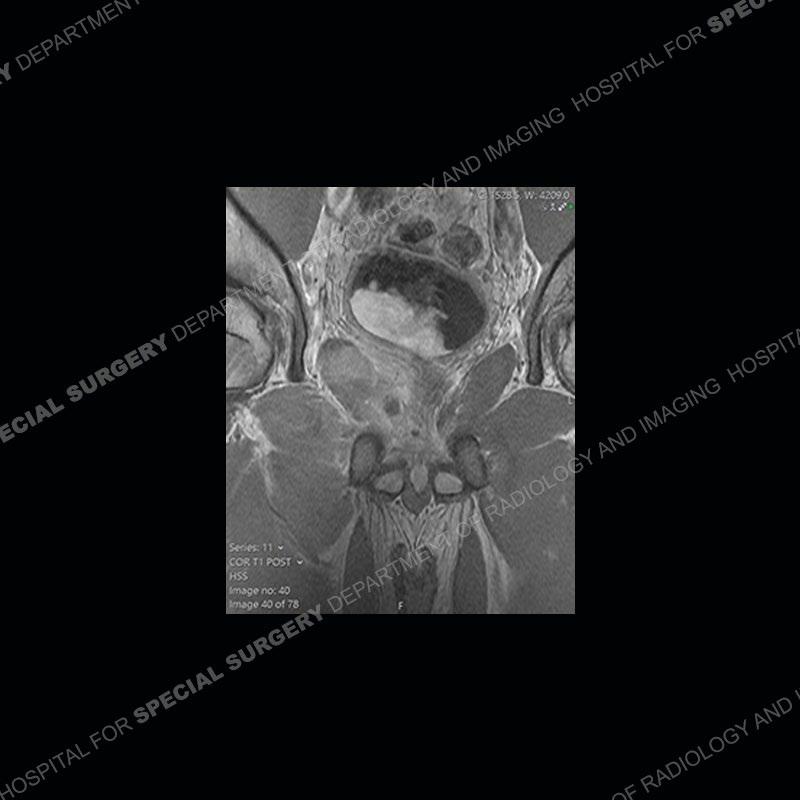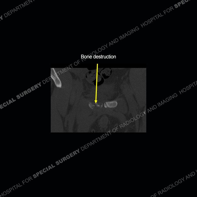 Radiographs did not demonstrate any clear abnormality. The MRI shows markedly abnormal signal of the right superior pubic ramus and abnormal signal/”mass” extending into the adjacent soft tissue. The inferior articular surface of the ramus showed what was thought to be bony destruction. CT examination shows a destructive process of the right superior pubic ramus.